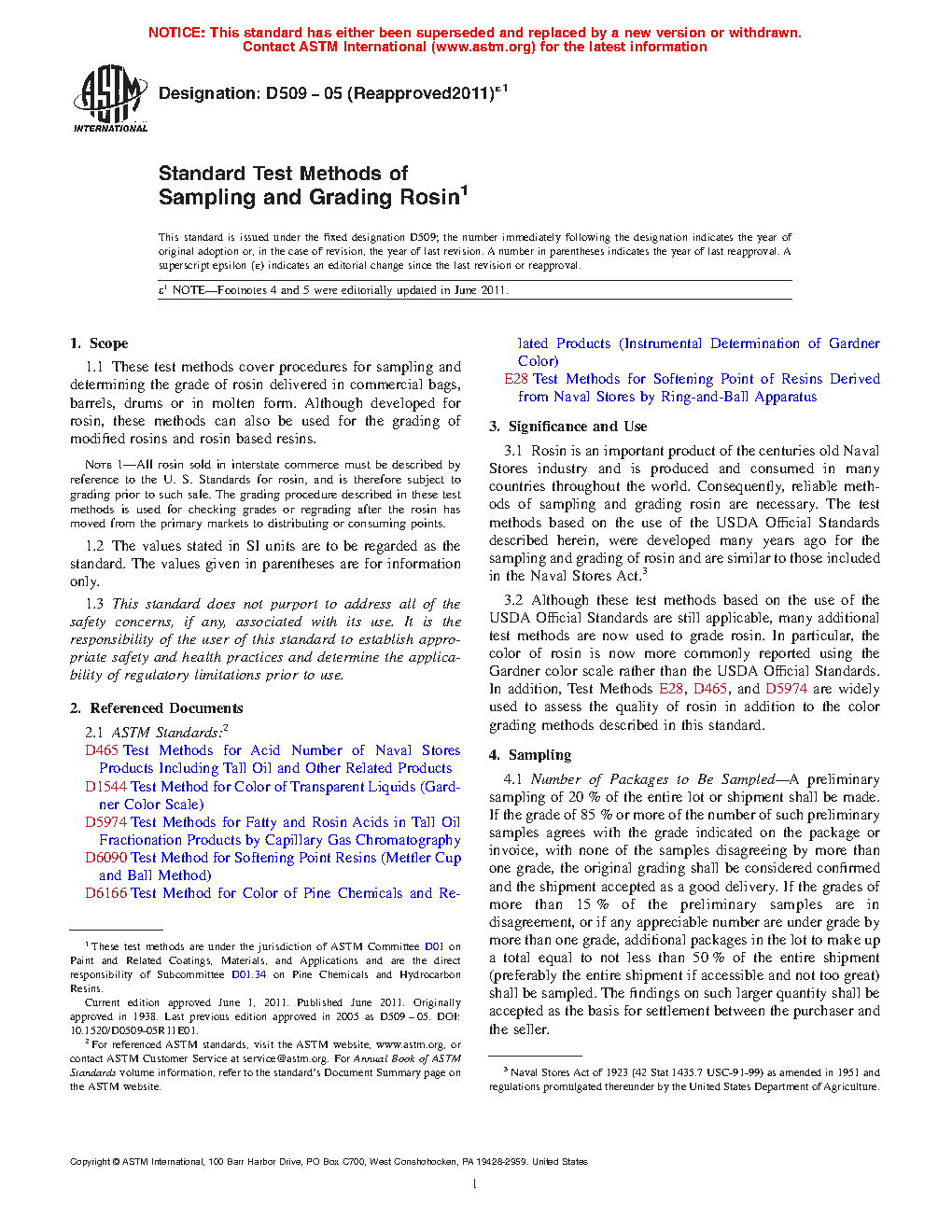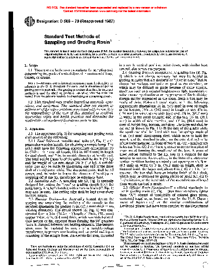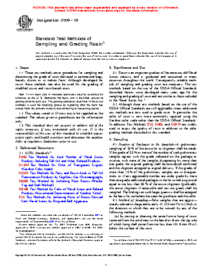 1.1 These test methods cover procedures for sampling and determining the grade of rosin delivered in commercial bags, barrels, drums or in molten form. Although developed for rosin, these methods can also be used for the grading of modified rosins and rosin based resins.