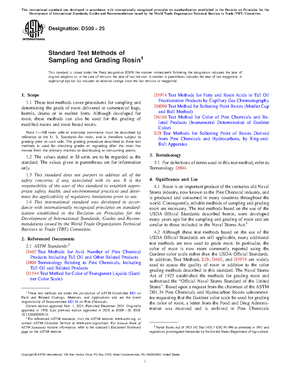3.1 Rosin is an important product of the centuries old Naval Stores industry, now known as the Pine Chemical industry, and is produced and consumed in many countries throughout the world. Consequently, reliable methods of sampling and grading rosin are necessary. The test methods based on the use of the USDA Official Standards described herein, were developed many years ago for the sampling and grading of rosin and are similar to those included in the Naval Stores Act.3