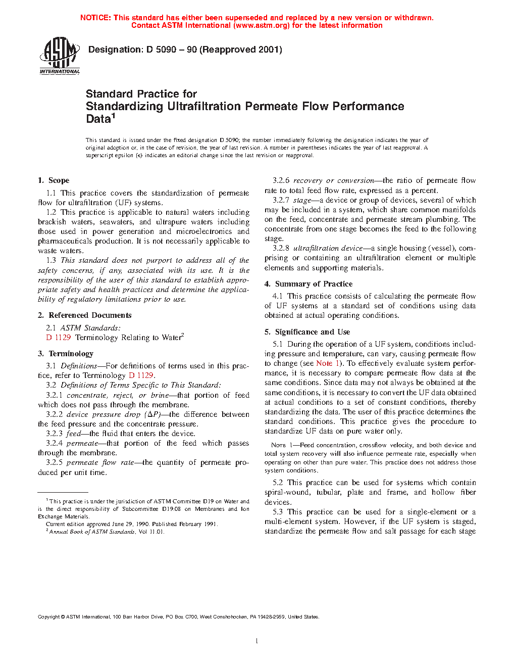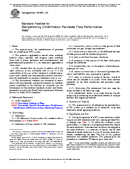 1.1 This practice covers the standardization of permeate flow for ultrafiltration (UF) systems.