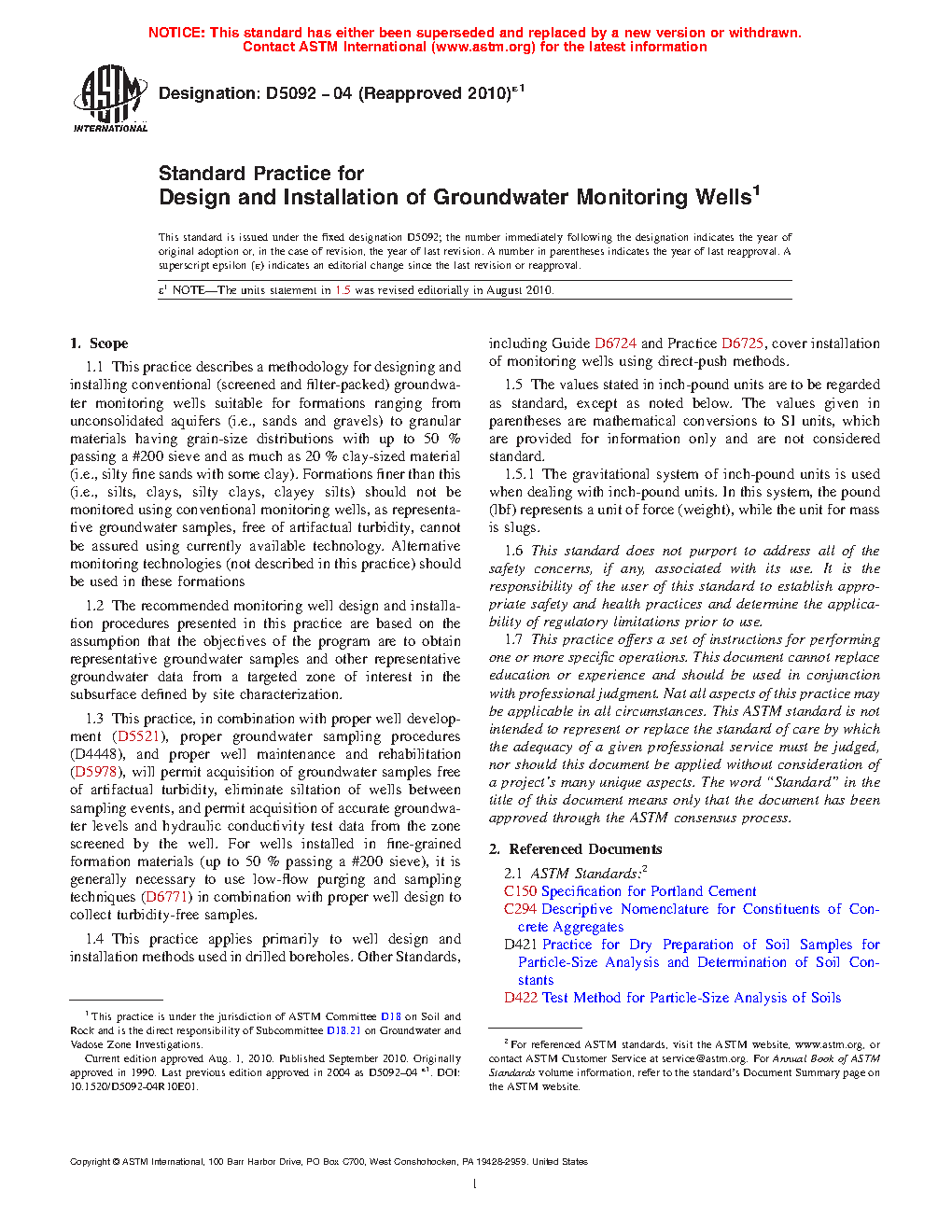 1.4 This practice applies primarily to well design and installation methods used in drilled boreholes. Other standards, including Guide D6724 and Practice D6725, cover installation of monitoring wells using direct-push methods.
