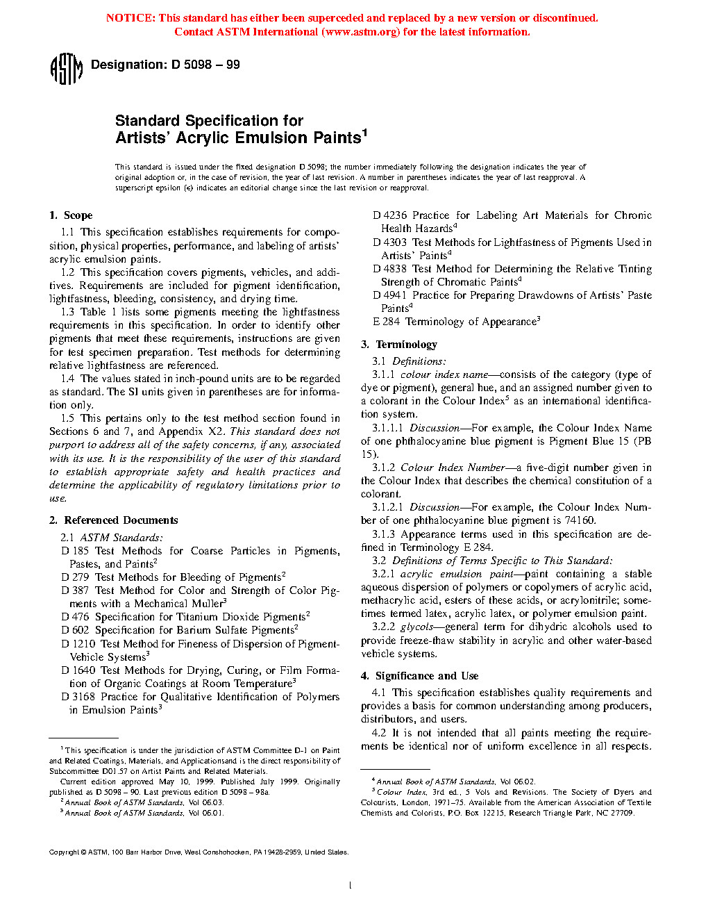 1.2 This specification covers pigments, vehicles, and additives. Requirements are included for pigment identification, lightfastness, bleeding, consistency, and drying time.