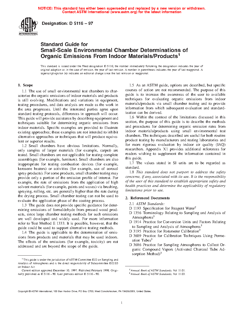 1.4 The use of small environmental test chambers to characterize the emissions of VOCs from indoor materials and products is still evolving. Modifications and variations in equipment, testing procedures, and data analysis are made as the work in the area progresses. For several indoor materials, more detailed ASTM standards for emissions testing have now been developed. Where more detailed ASTM standard practices or methods exist, they supersede this guide and should be used in its place. Until the interested parties agree upon standard testing protocols, differences in approach will occur. This guide will continue to provide assistance by describing equipment and techniques suitable for determining organic emissions from indoor materials. Specific examples are provided to illustrate existing approaches; these examples are not intended to inhibit alternative approaches or techniques that will produce equivalent or superior results.