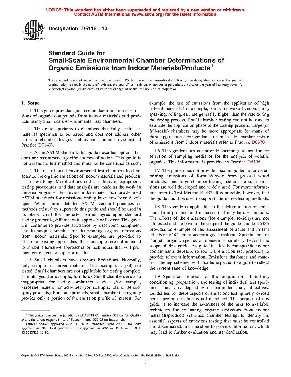 1.9 This guide is applicable to the determination of emissions from products and materials that may be used indoors. The effects of the emissions (for example, toxicity) are not addressed and are beyond the scope of the guide. Guide D6485 provides an example of the assessment of acute and irritant effects of VOC emissions for a given material. Specification of “target” organic species of concern is similarly beyond the scope of this guide. As guideline levels for specific indoor contaminants develop, so too will emission test protocols to provide relevant information. Emissions databases and material labeling schemes will also be expected to adjust to reflect the current state of knowledge.
