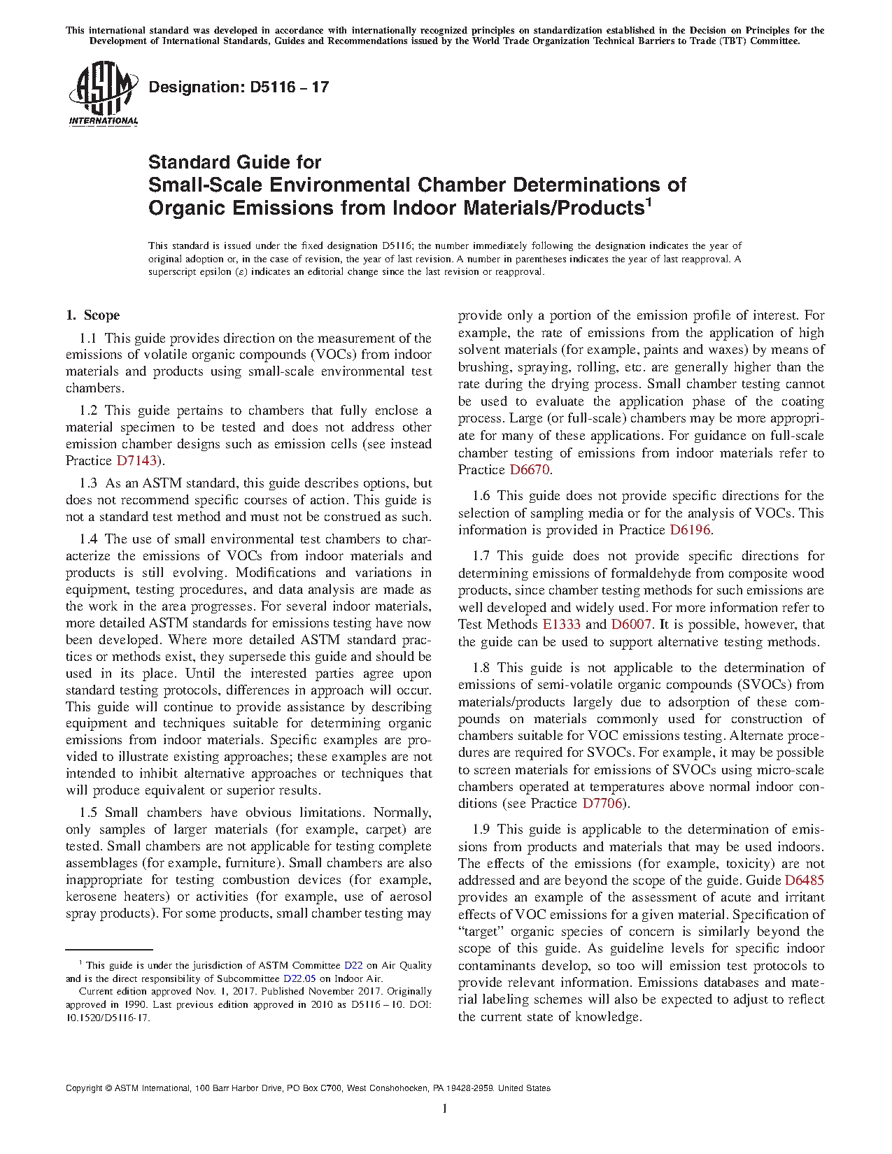 1.1 This guide provides direction on the measurement of the emissions of volatile organic compounds (VOCs) from indoor materials and products using small-scale environmental test chambers.