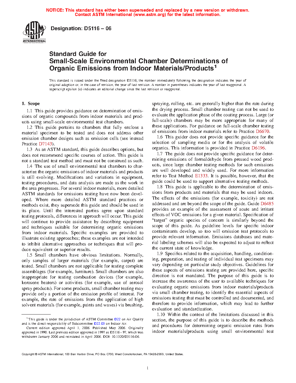 1.11 Within the context of the limitations discussed in this section, the purpose of this guide is to describe the methods and procedures for determining organic emission rates from indoor materials/products using small environmental test chambers. The techniques described are useful for both routine product testing by manufacturers and testing laboratories and for more rigorous evaluation by indoor air quality (IAQ) researchers. Appendix X1 provides references to standards that are widely employed to measure emissions of VOCs from materials and products used in the interiors of buildings. Some of these standards directly reference this guide.