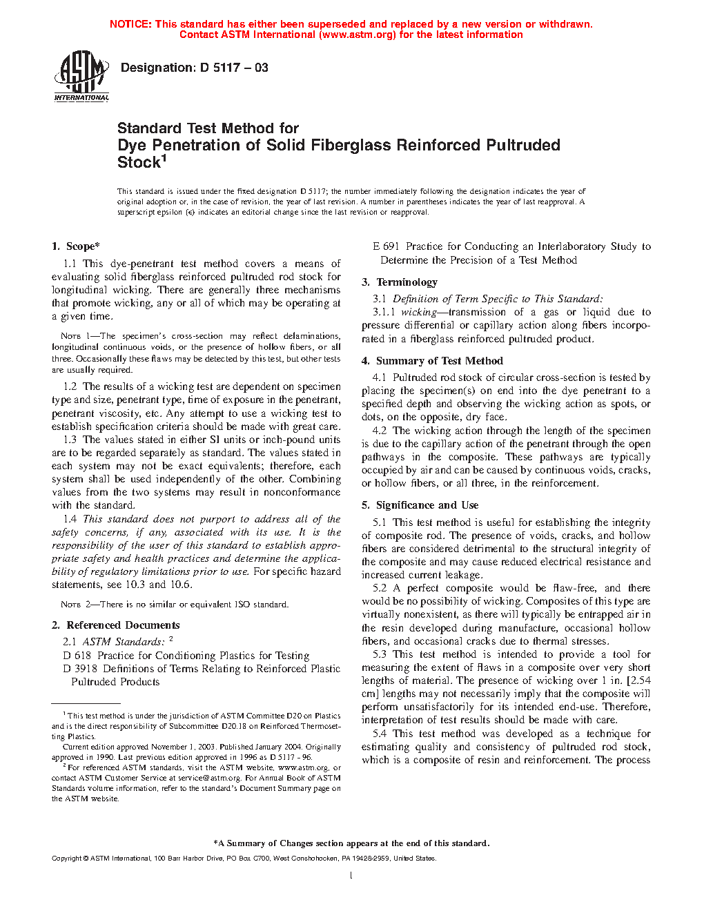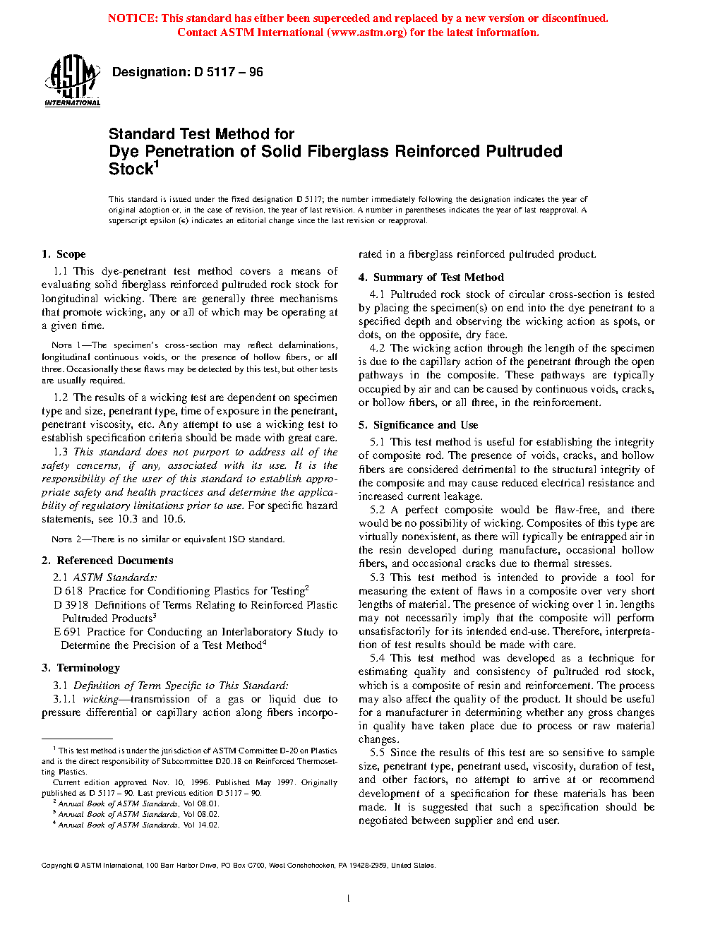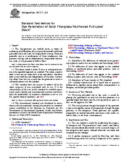 1.1 This dye-penetrant test method covers a means of evaluating solid fiberglass all-roving reinforced pultruded rod or bar stock for longitudinal wicking. There are generally three mechanisms that promote wicking such as delaminations, longitudinal continuous voids, or the presence of hollow fibers. Any or all of them will be operating at a given time.