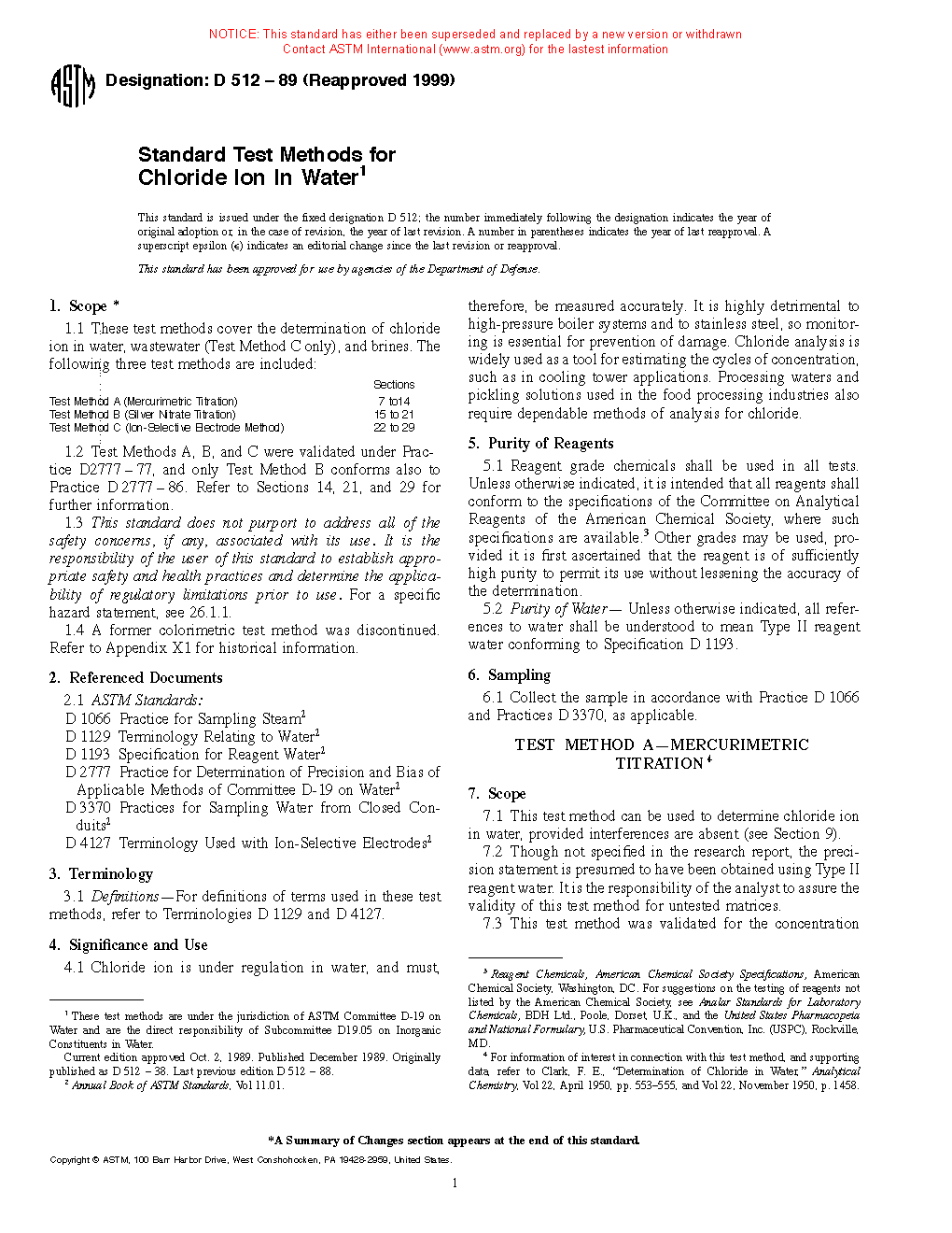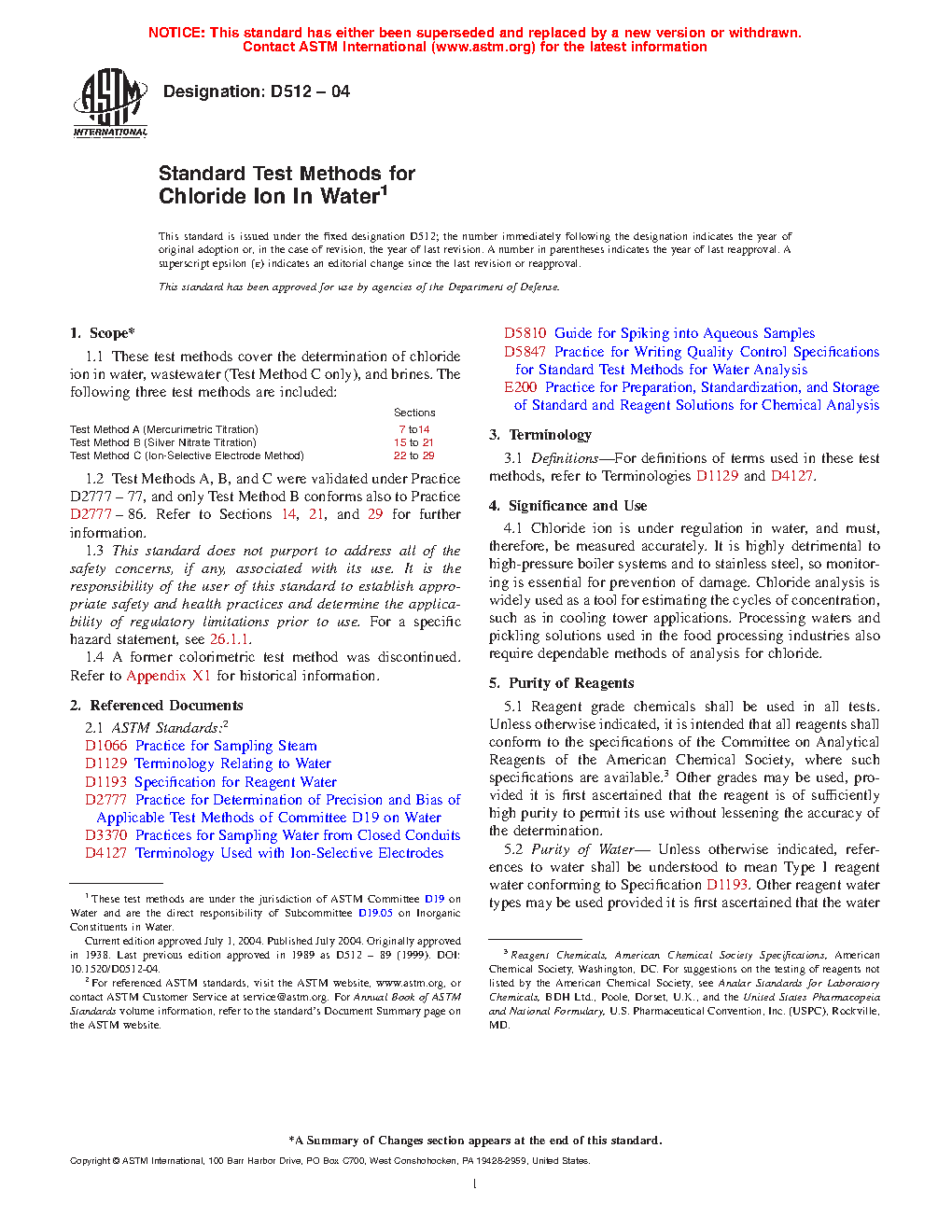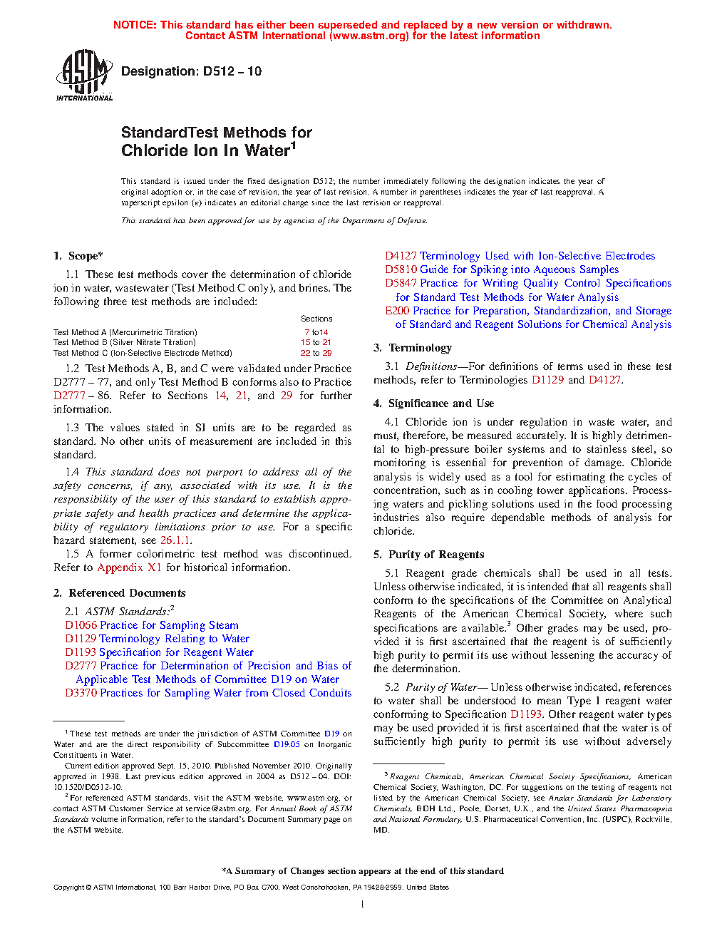 1.1 These test methods cover the determination of chloride ion in water, wastewater (Test Method C only), and brines. The following three test methods are included: