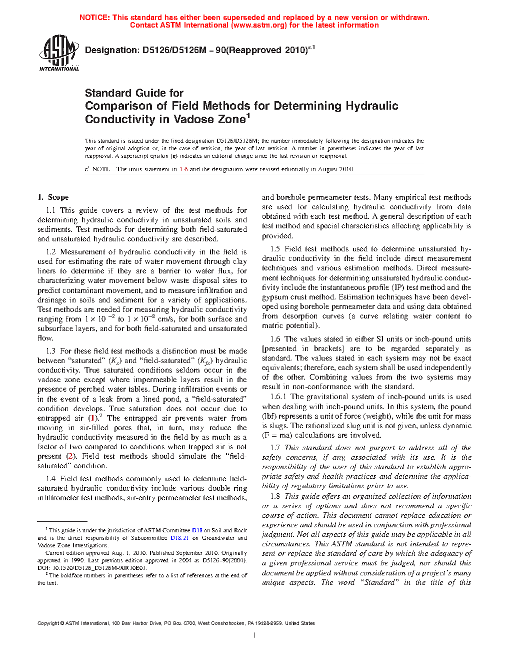 1.1 This guide covers a review of the test methods for determining hydraulic conductivity in unsaturated soils and sediments. Test methods for determining both field-saturated and unsaturated hydraulic conductivity are described.