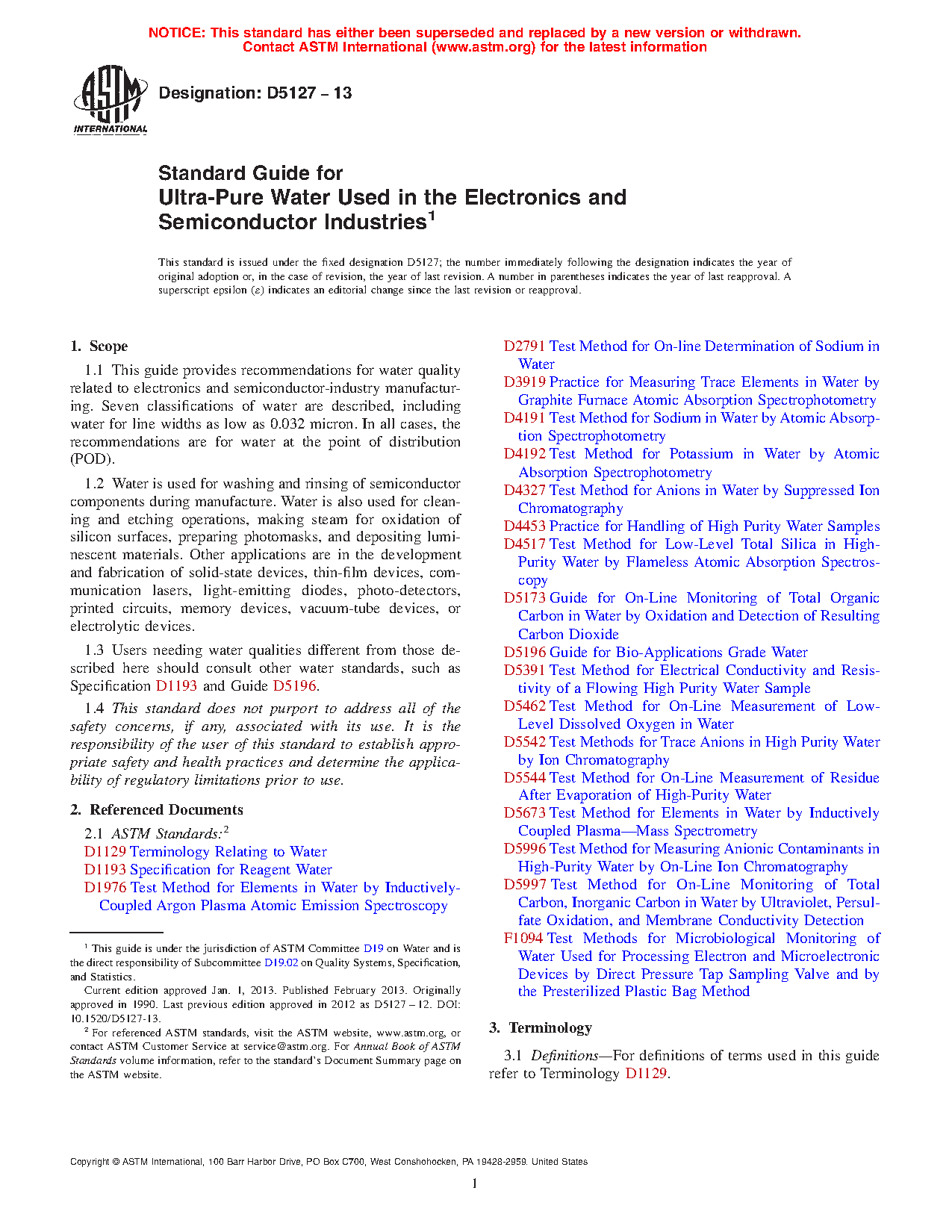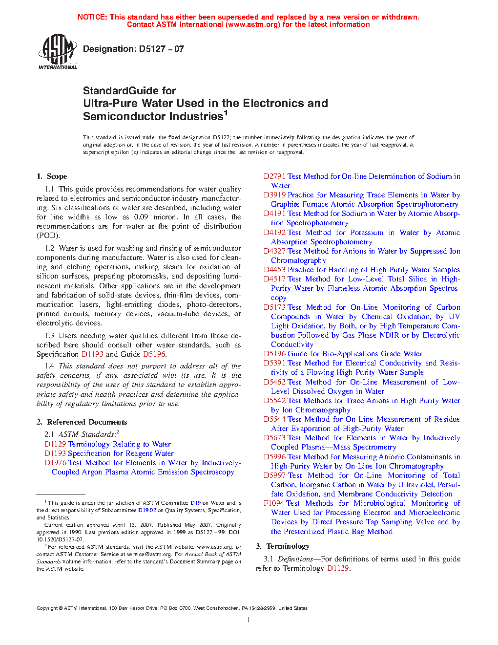 This guide recommends the water quality required for the electronics and microelectronics industries. High-purity water is required to prevent contamination of products during manufacture, since contamination can lead to an unacceptable, low yield of electronic devices.