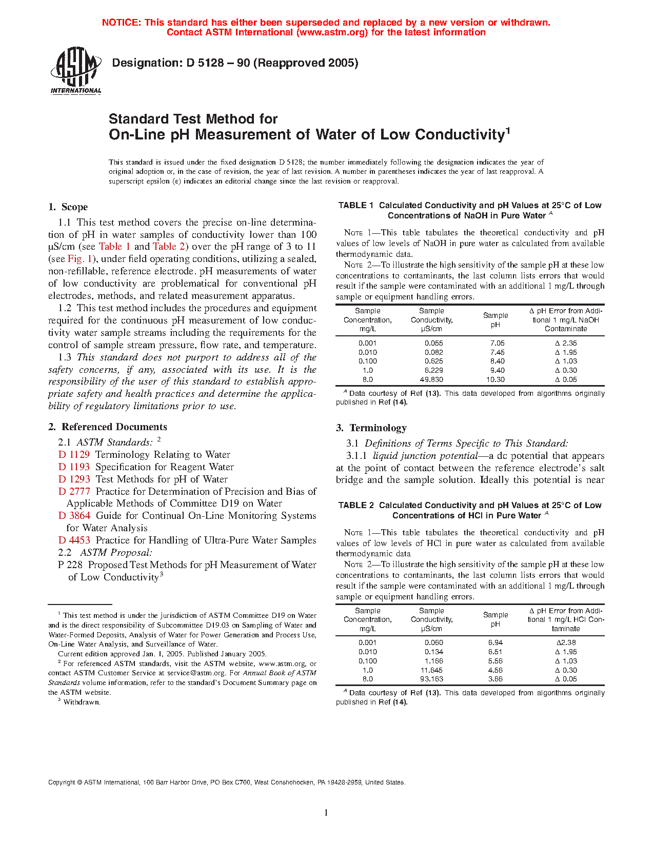 5.3 Conventional pH measurements are made in solutions that contain relatively large amounts of acid, base, or dissolved salts. Under these conditions, pH determinations may be made quickly and precisely. Continuous on-line pH measurements in water samples of low conductivity are more difficult (4, 5). These low ionic strength solutions are susceptible to contamination from the atmosphere, sample stream hardware, and the pH electrodes. Variations in the constituent concentration of low conductivity waters cause liquid junction potential shifts (see 3.2.1) resulting in pH measurement errors. Special precautions are required.