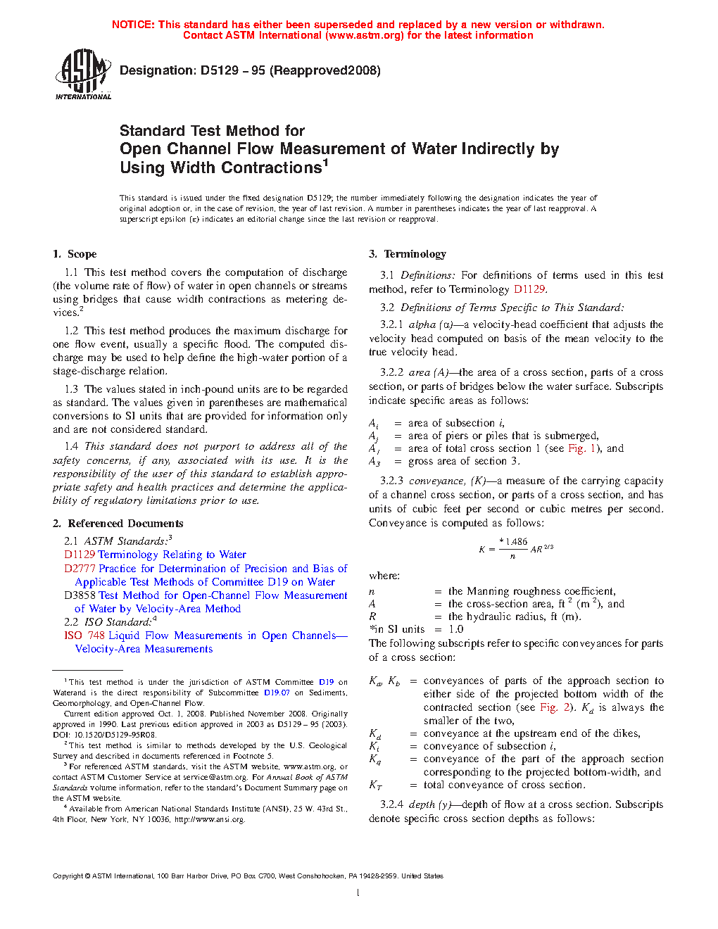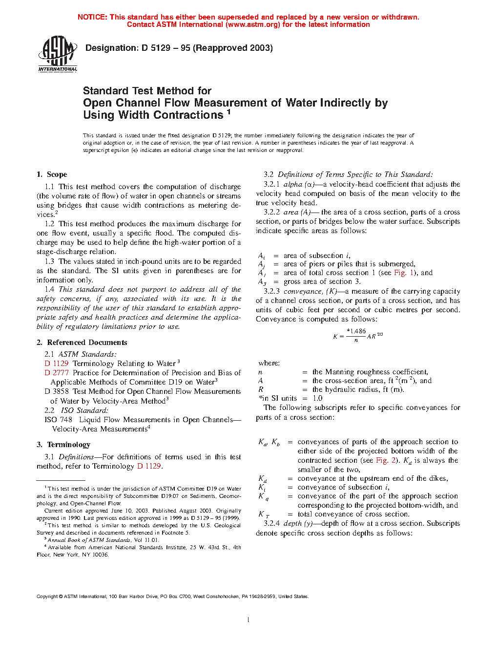 5.3 Under the worst conditions, access roads are blocked, cableways and bridges may be washed out, and knowledge of the flood frequently comes too late. Therefore, some type of indirect measurement is necessary. The contracted-opening method is commonly used on valley-floor streams.