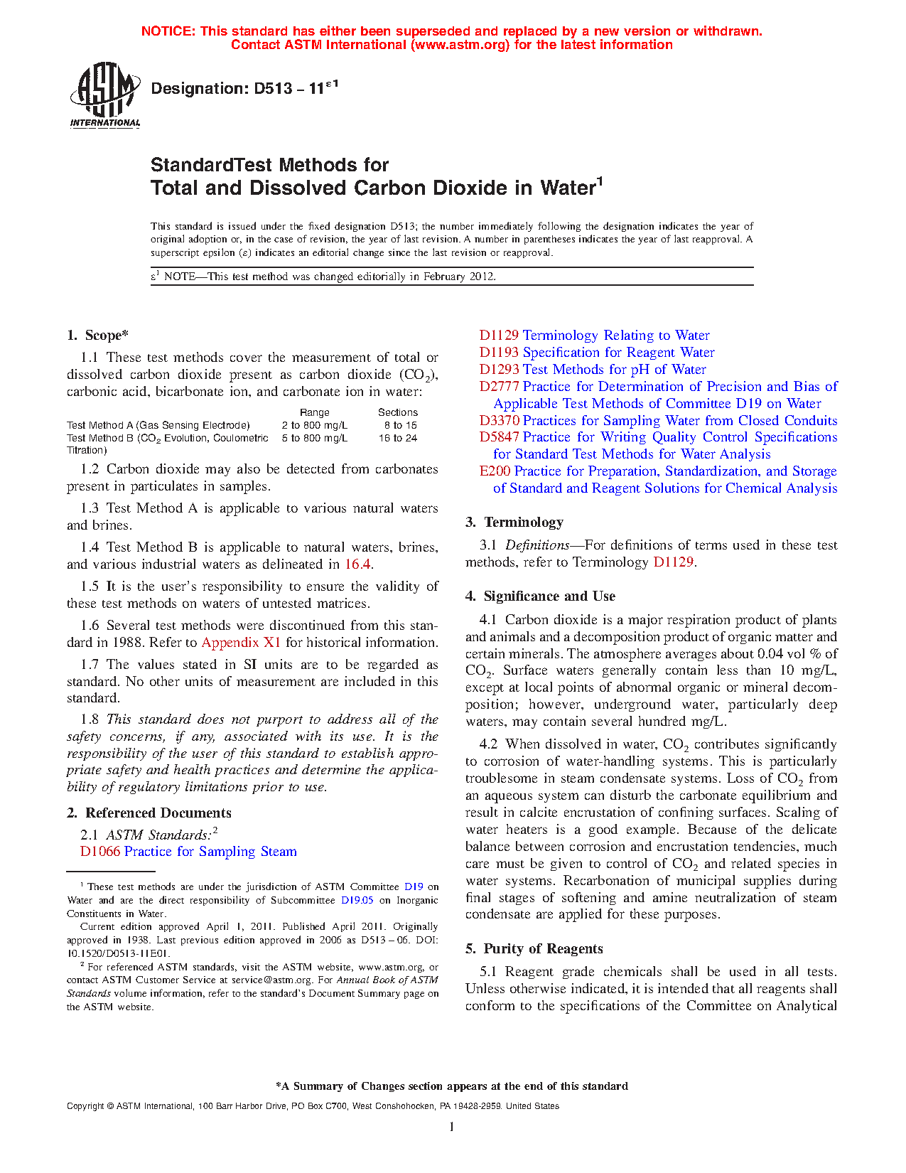 1.1 These test methods cover the measurement of total or dissolved carbon dioxide present as carbon dioxide (CO2), carbonic acid, bicarbonate ion, and carbonate ion in water: