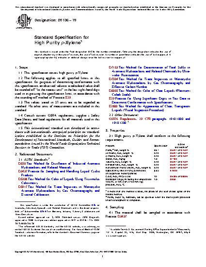 This specification establishes the requirements for p-Xylene. Sampled specimens shall conform to the following physical and chemical properties: minimum purity; maximum m-Xylene content; maximum o-Xylene content; maximum sulfur content; maximum toluene content; maximum ethylbenzene content; maximum nonaromatic hydrocarbons content; appearance; color (Pt/Co scale); distillation range; and maximum pressure.