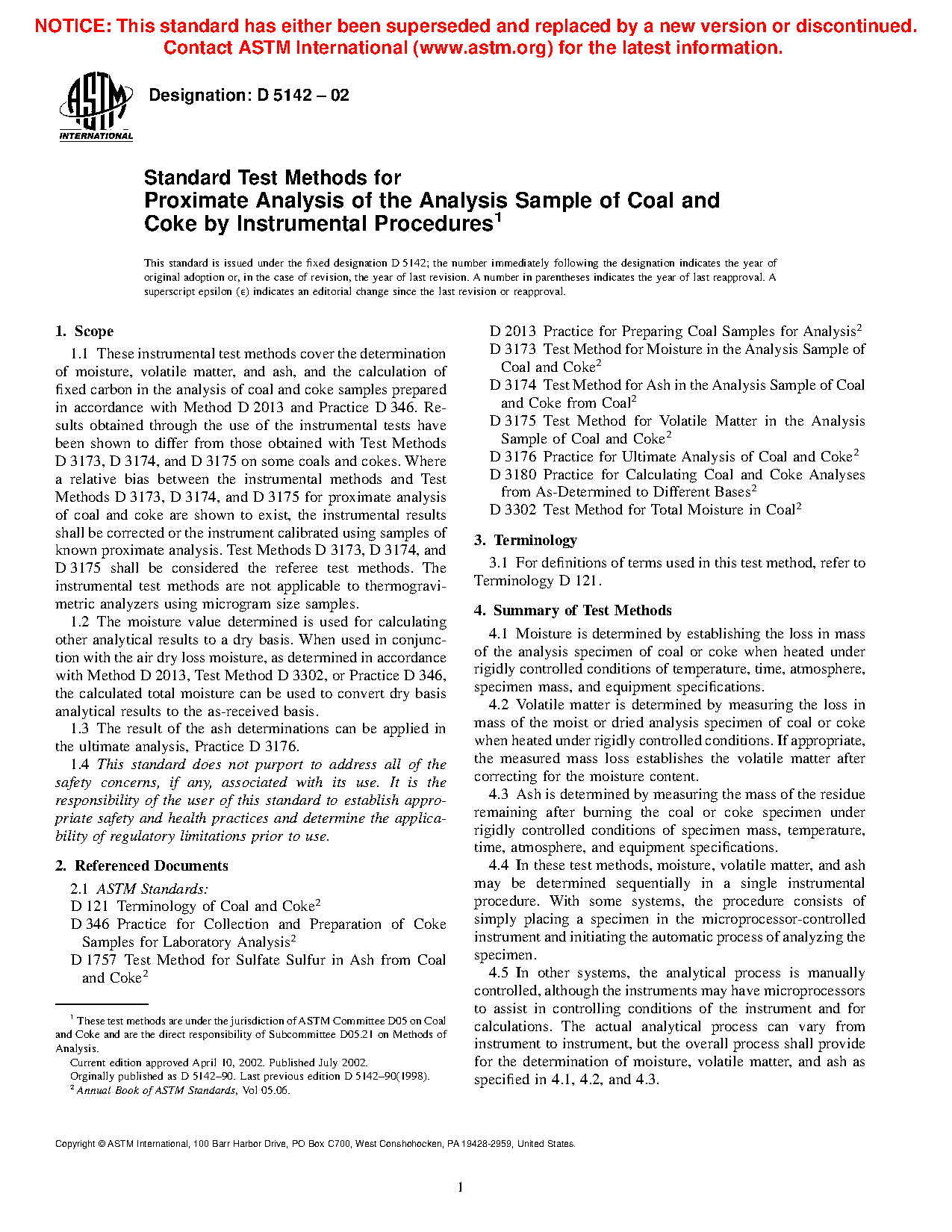 1.1 These instrumental test methods cover the determination of moisture, volatile matter, and ash, and the calculation of fixed carbon in the analysis of coal and coke samples prepared in accordance with Method D2013 and Practice D346. Results obtained through the use of the instrumental tests have been shown to differ from those obtained with Test Methods D3173, D3174, and D3175 on some coals and cokes. Where a relative bias between the instrumental methods and Test Methods D3173, D3174, and D3175 for proximate analysis of coal and coke are shown to exist, the instrumental results shall be corrected or the instrument calibrated using samples of known proximate analysis. Test Methods D3173, D3174, and D3175 shall be considered the referee test methods. The instrumental test methods are not applicable to thermogravimetric analyzers utilizing microgram size samples.
