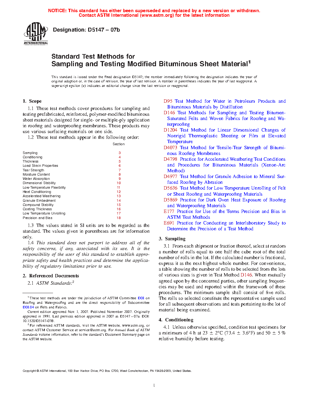 These test methods are used for sampling and testing modified bitumen sheet materials. Property requirements, determined by these test methods, are found in the following product standards: Specifications D6162, D6163, D6164, D6222, D6223, D6298, and D6509.
