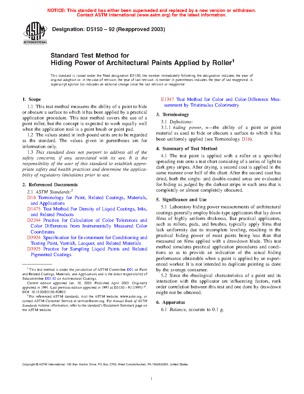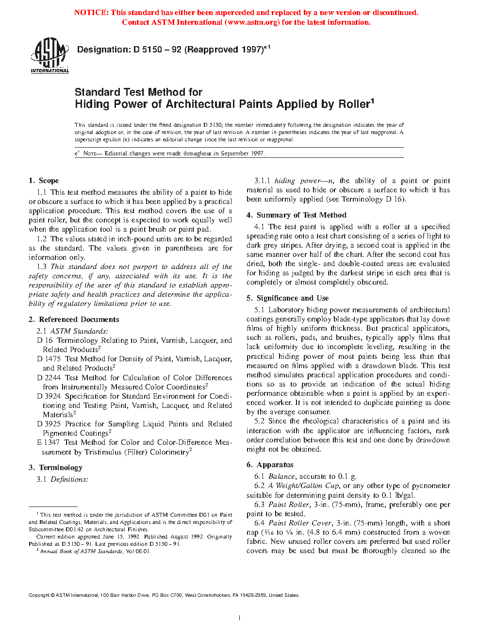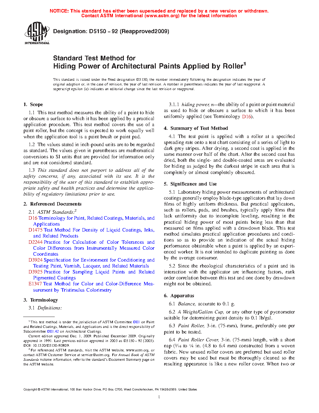 1.1 This test method measures the ability of a paint to hide or obscure a surface to which it has been applied by a practical application procedure. This test method covers the use of a paint roller, but the concept is expected to work equally well when the application tool is a paint brush or paint pad.