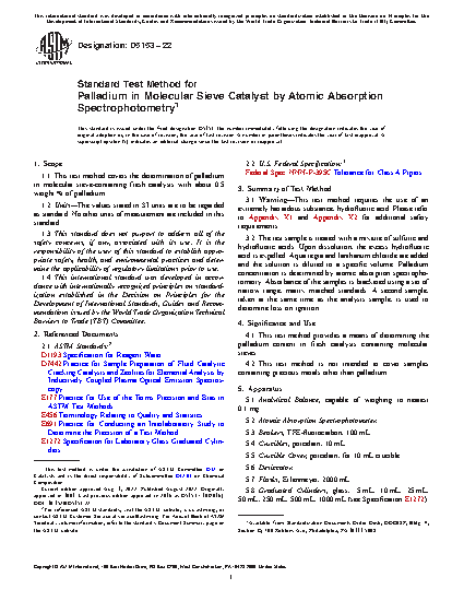 1.1 This test method covers the determination of palladium in molecular sieve-containing fresh catalysts with about 0.5 weight % of palladium.