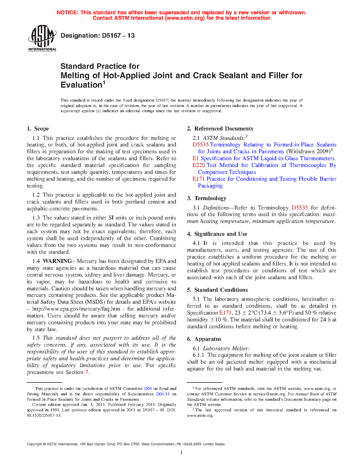 1.1 This practice establishes the procedure for melting or heating, or both, of hot-applied joint and crack sealants and fillers in preparation for the making of test specimens used in the laboratory evaluations of the sealants and fillers. Refer to the specific standard material specification for sampling requirements, test sample quantity, temperatures and times for melting and heating, and the number of specimens required for testing.