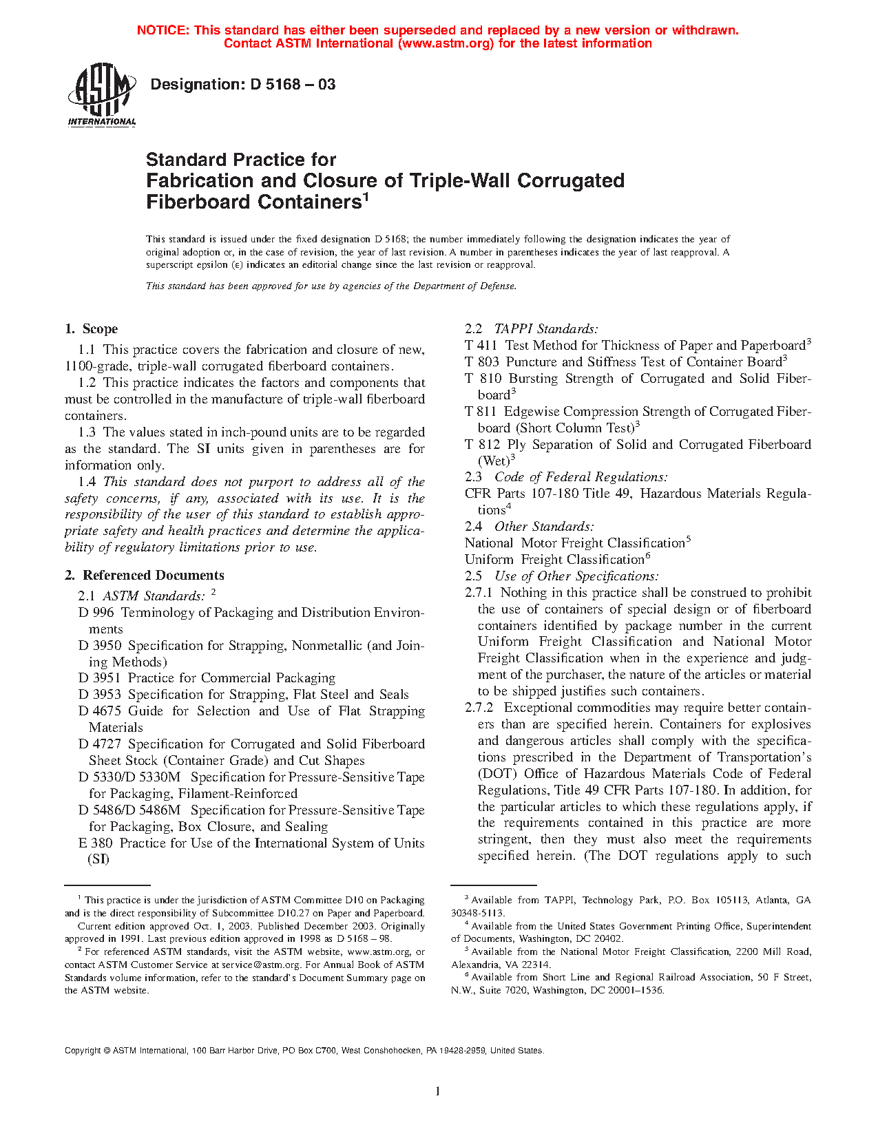 1.2 This practice indicates the factors and components that must be controlled in the manufacture of triple-wall fiberboard containers.