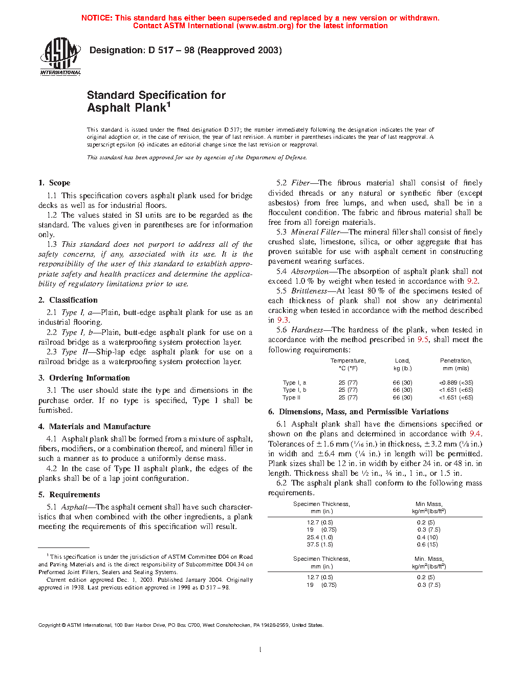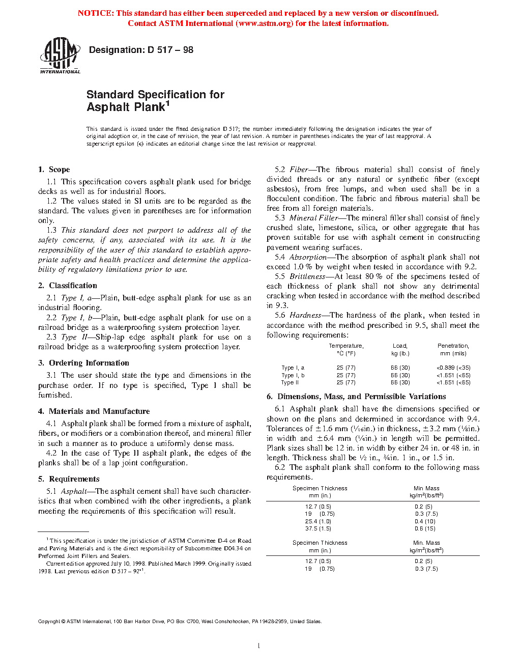 This specification covers asphalt plank used for bridge decks as well as for industrial floors. Asphalt planks shall be classified according to usage: Type Ia; Type Ib; and Type II. Asphalt plank shall be formed from a mixture of asphalt, fibers, modifiers, or a combination thereof, and mineral filler in such a manner as to produce a uniformly dense mass. The following test methods shall be intended to measure those attributes necessary to measure the ability of asphalt plank to provide a reasonably long and satisfactory service: absorption; brittleness; dimensions; and hardness.