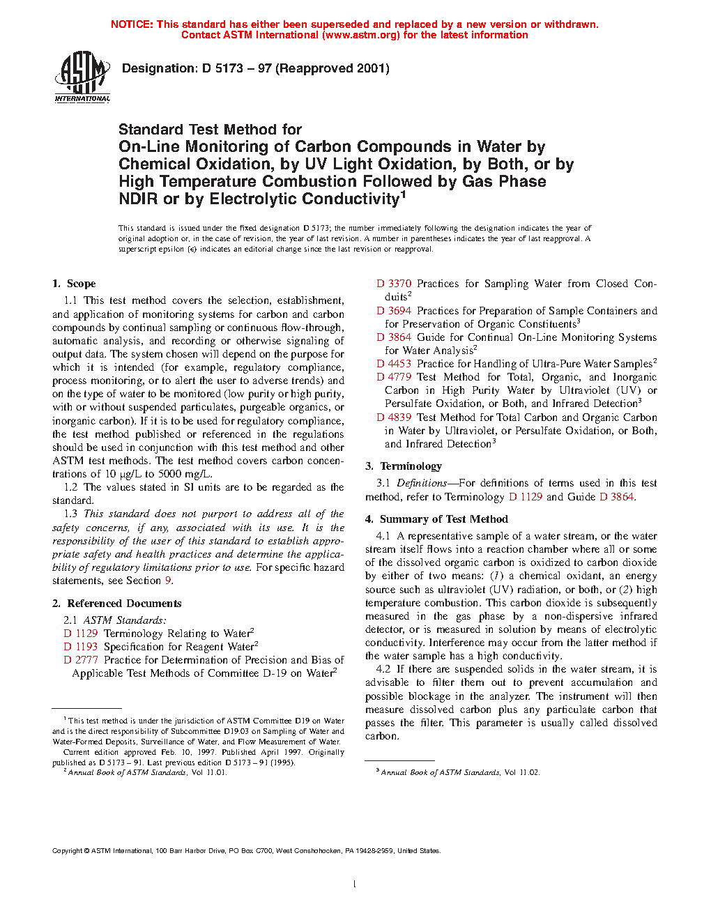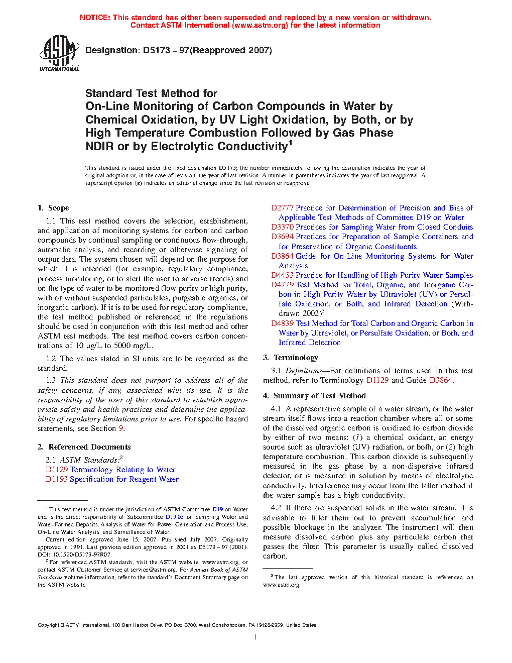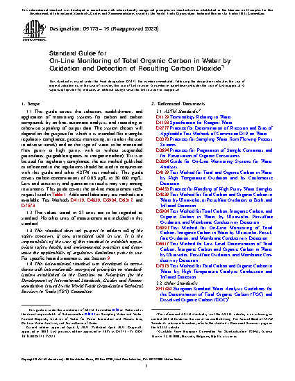 1.1 This guide covers the selection, establishment, and application of monitoring systems for carbon and carbon compounds by on-line, automatic analysis, and recording or otherwise signaling of output data. The system chosen will depend on the purpose for which it is intended (for example, regulatory compliance, process monitoring, or to alert the user to adverse trends) and on the type of water to be monitored (low purity or high purity, with or without suspended particulates, purgeable organics, or inorganic carbon). If it is to be used for regulatory compliance, the test method published or referenced in the regulations should be used in conjunction with this guide and other ASTM test methods. This guide covers carbon concentrations of 0.05 µg/L to 50 000 mg/L. Low end sensitivity and quantitative results may vary among instruments. This guide covers the on-line measurement techniques listed in Table 1. Additional laboratory test methods are available: Test Methods D4129, D4839, D5904, D6317, and D7573.