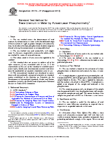 1.1 This test method covers the determination of total uranium, by mass concentration, in water within the calibrated range of the instrument, 0.1 µg/L or greater. Samples with uranium mass concentrations above the laser phosphorimeter dynamic range are diluted to bring the concentration to a measurable level.
