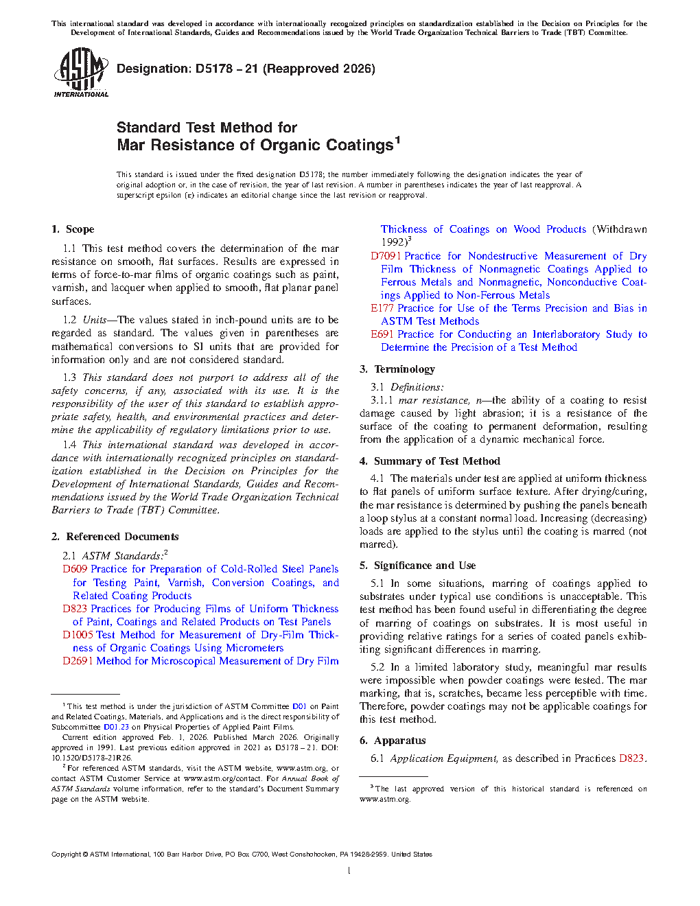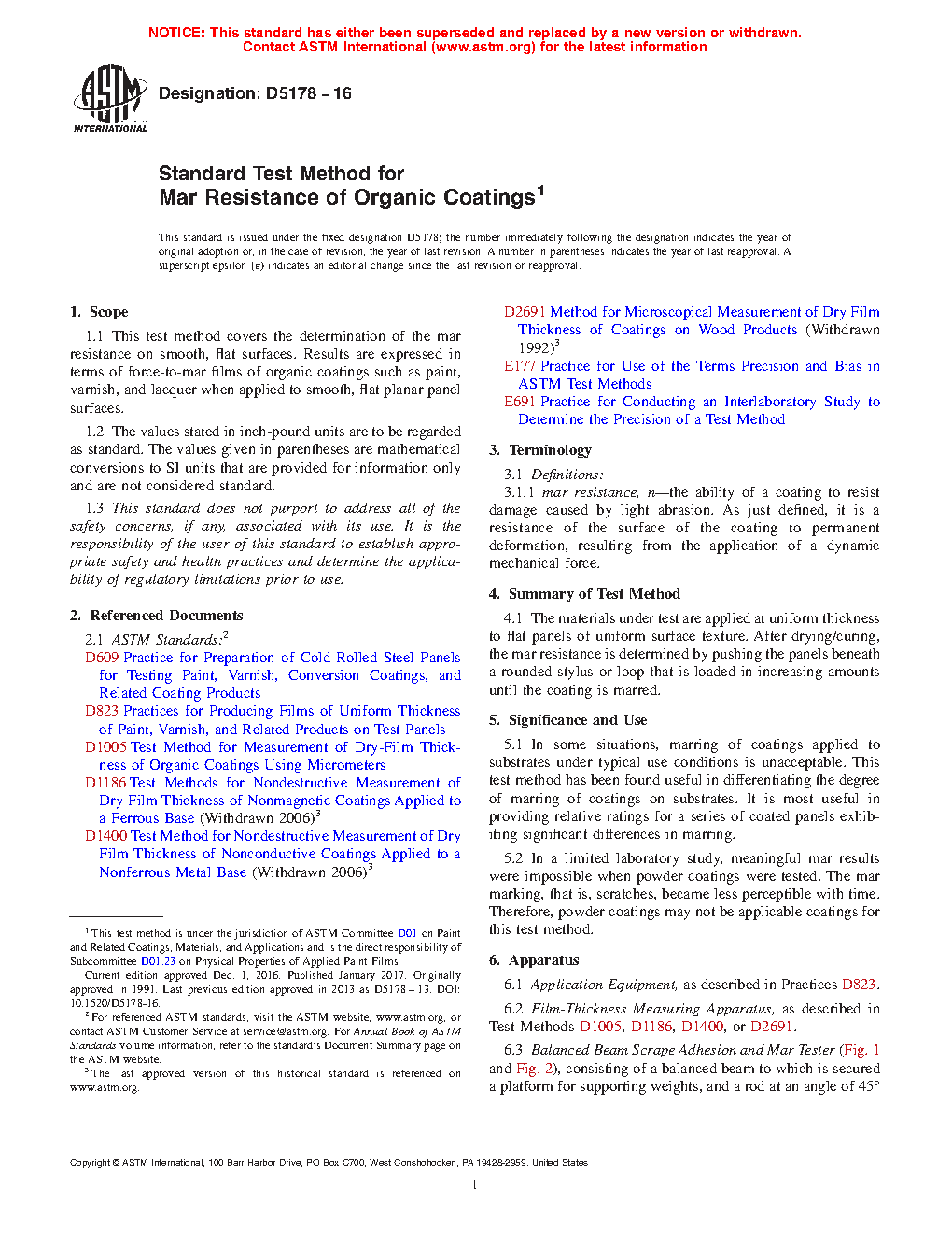 1.1 This test method covers the determination of the mar resistance on smooth, flat surfaces. Results are expressed in terms of force-to-mar films of organic coatings such as paint, varnish, and lacquer when applied to smooth, flat planar panel surfaces.