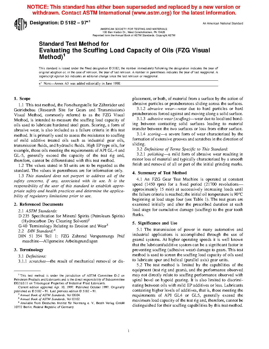 1.1 This test method, the Forschungstelle für Záhnräder und Getriebebau (Research Site for Gears and Transmissions) Visual Method, commonly referred to as the FZG Visual Method, is intended to measure the scuffing load capacity of oils used to lubricate hardened steel gears. Scoring, a form of abrasive wear, is also included as a failure criteria in this test method. It is primarily used to assess the resistance to scuffing of mild additive treated oils such as industrial gear oils, transmission fluids, and hydraulic fluids. High EP type oils, for example, those oils meeting the requirements of API GL-4 and GL-5, generally exceed the capacity of the test rig and, therefore, cannot be differentiated with this test method.