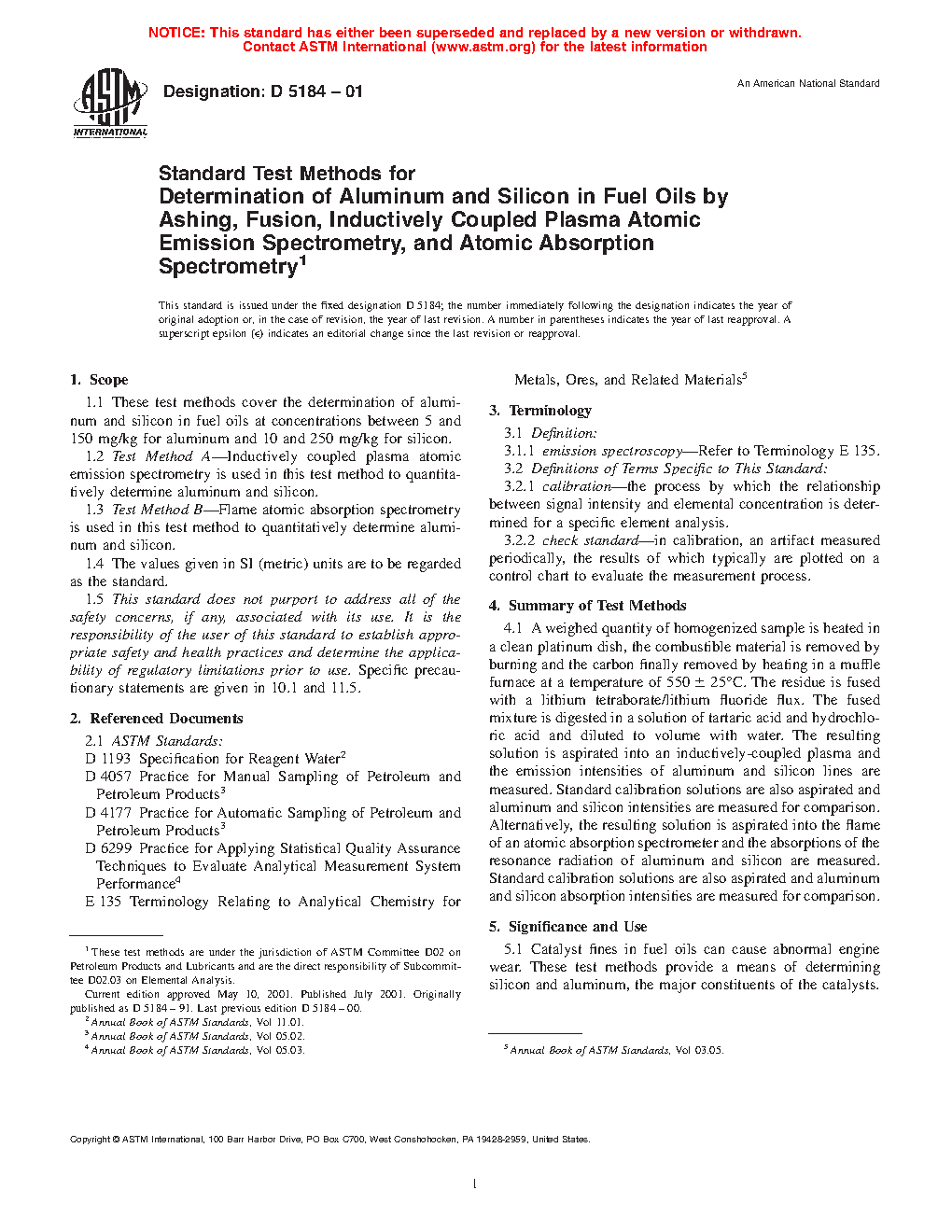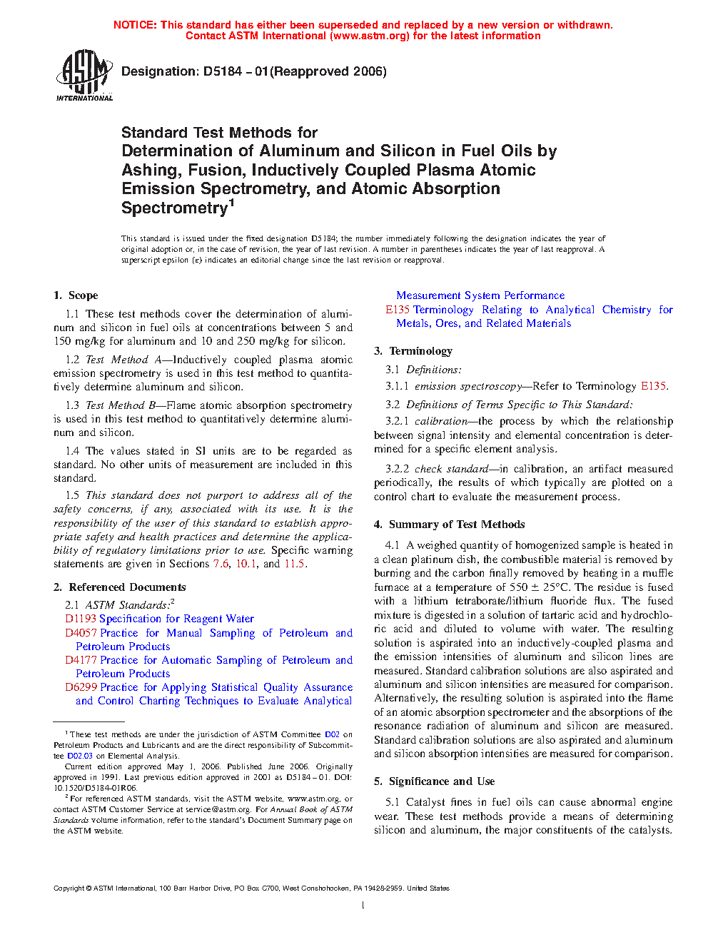 1.1 These test methods cover the determination of aluminum and silicon in fuel oils at concentrations between 5 mg/kg and 150 mg/kg for aluminum and 10 mg/kg and 250 mg/kg for silicon.