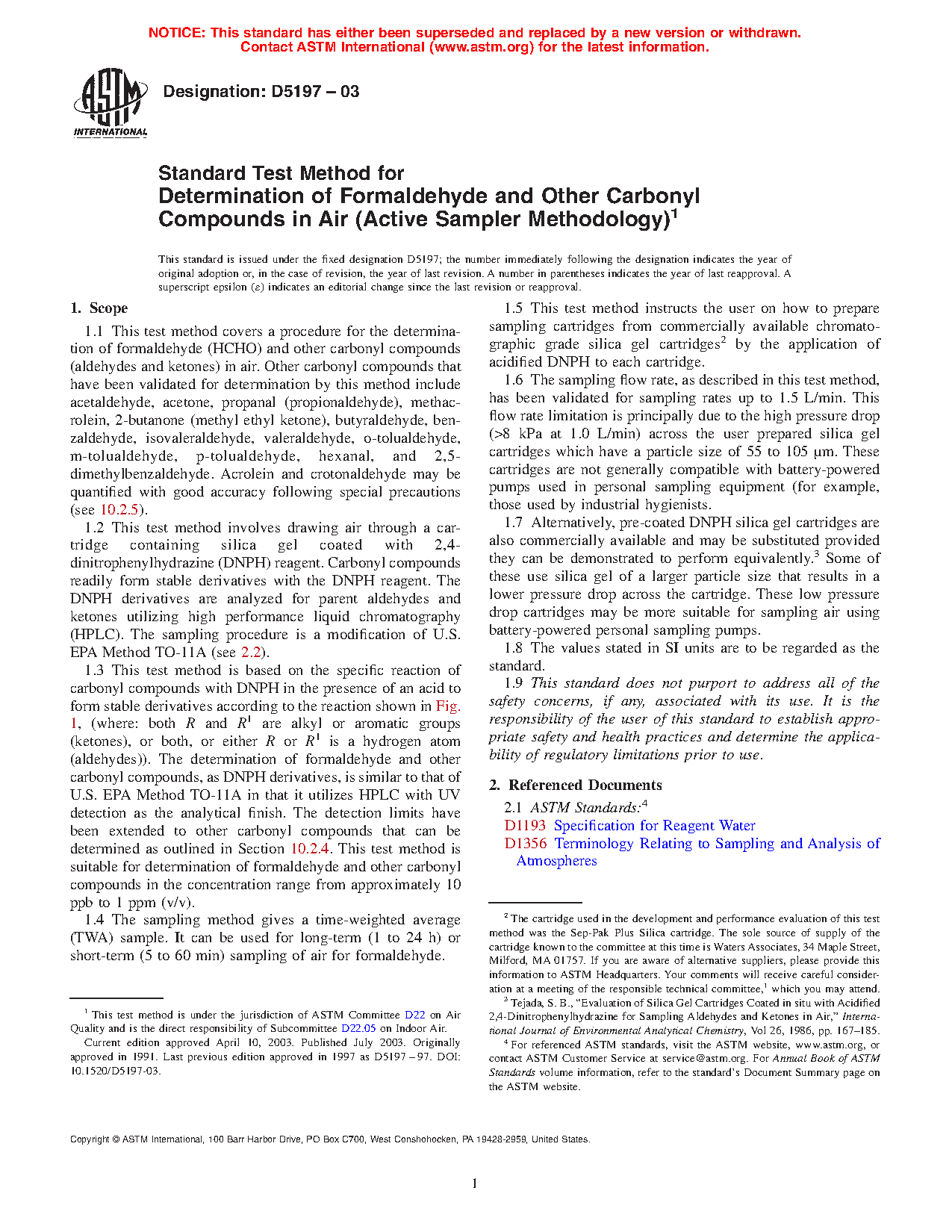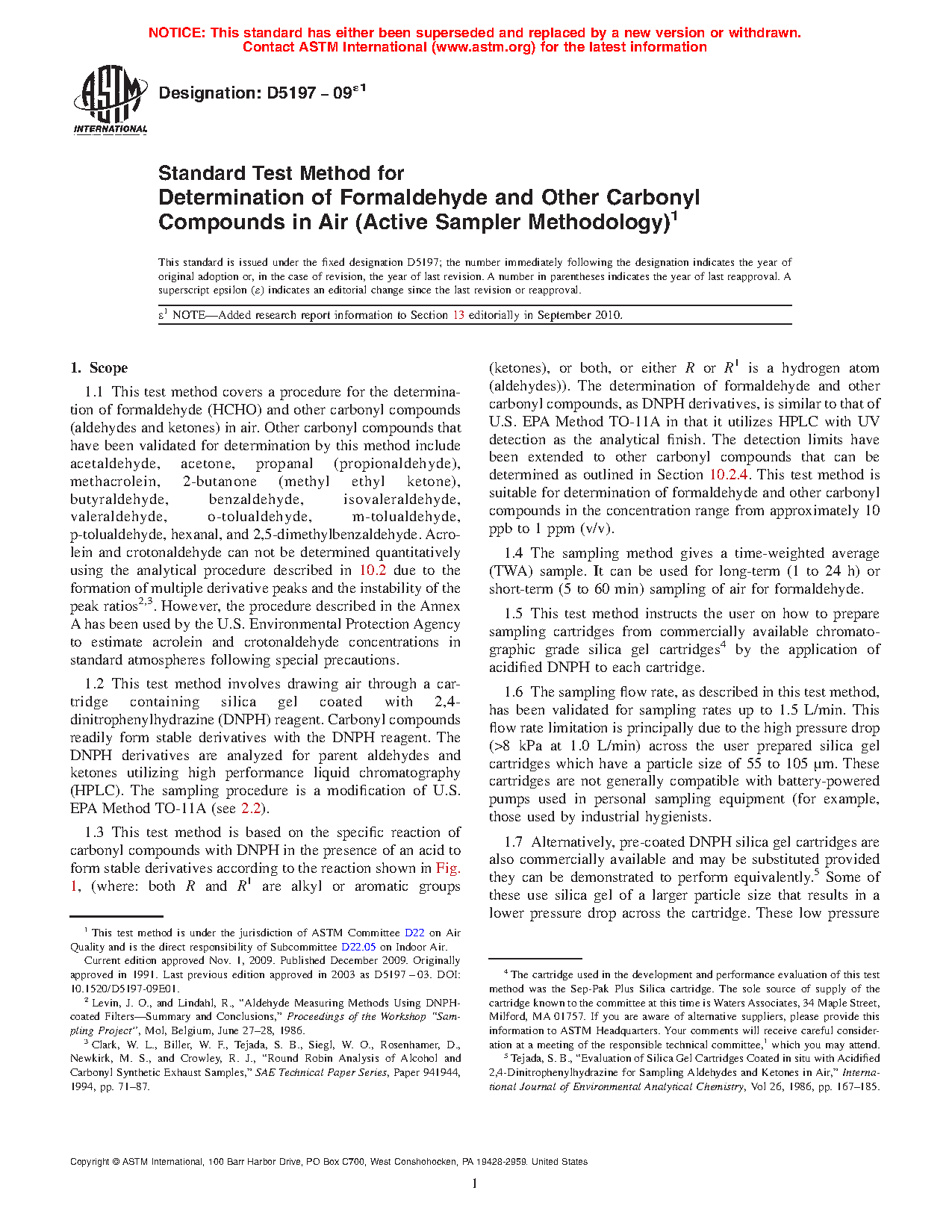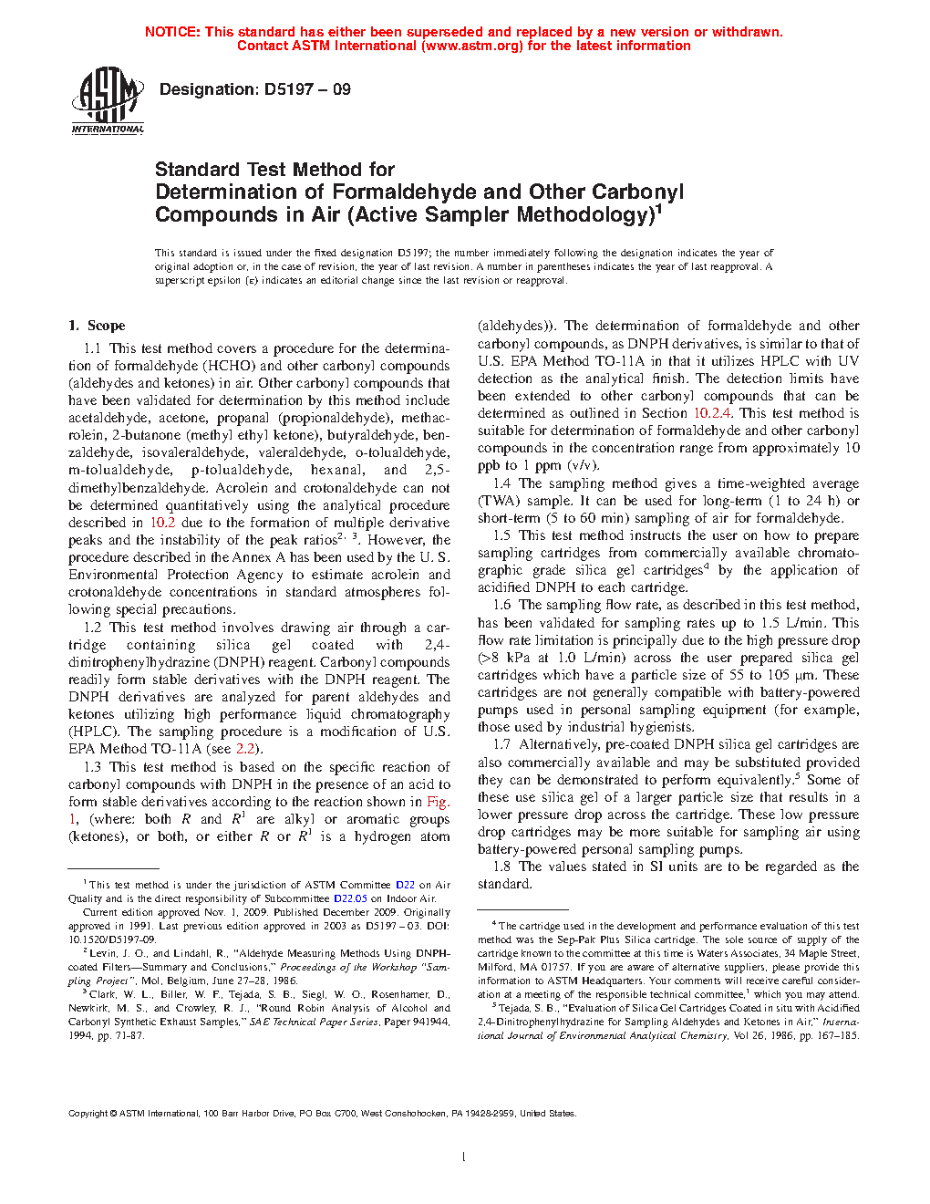 1.2 This test method involves drawing air through a cartridge containing silica gel coated with 2,4-dinitrophenylhydrazine (DNPH) reagent. Carbonyl compounds readily form stable derivatives with the acidified DNPH reagent. The DNPH derivatives are analyzed for parent aldehydes and ketones using high performance liquid chromatography (HPLC) or ultra-high performance liquid chromatography (UHPLC). UHPLC systems use higher pressures and smaller particle sizes in columns compared to HPLC systems. The sampling procedure is a modification of U.S. EPA Method TO-11A (see 2.2).