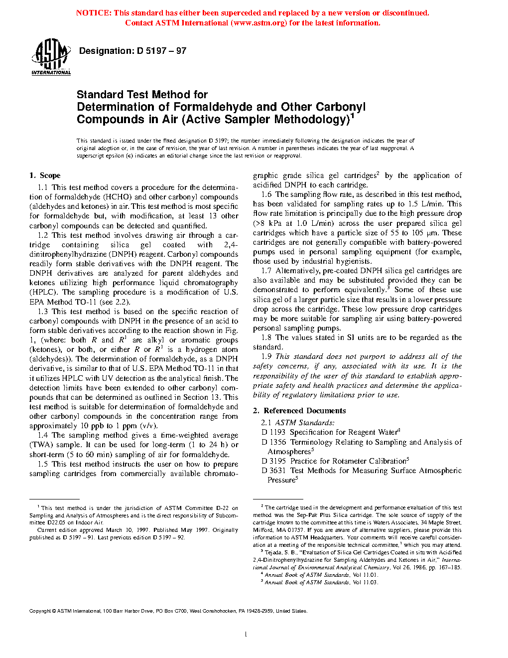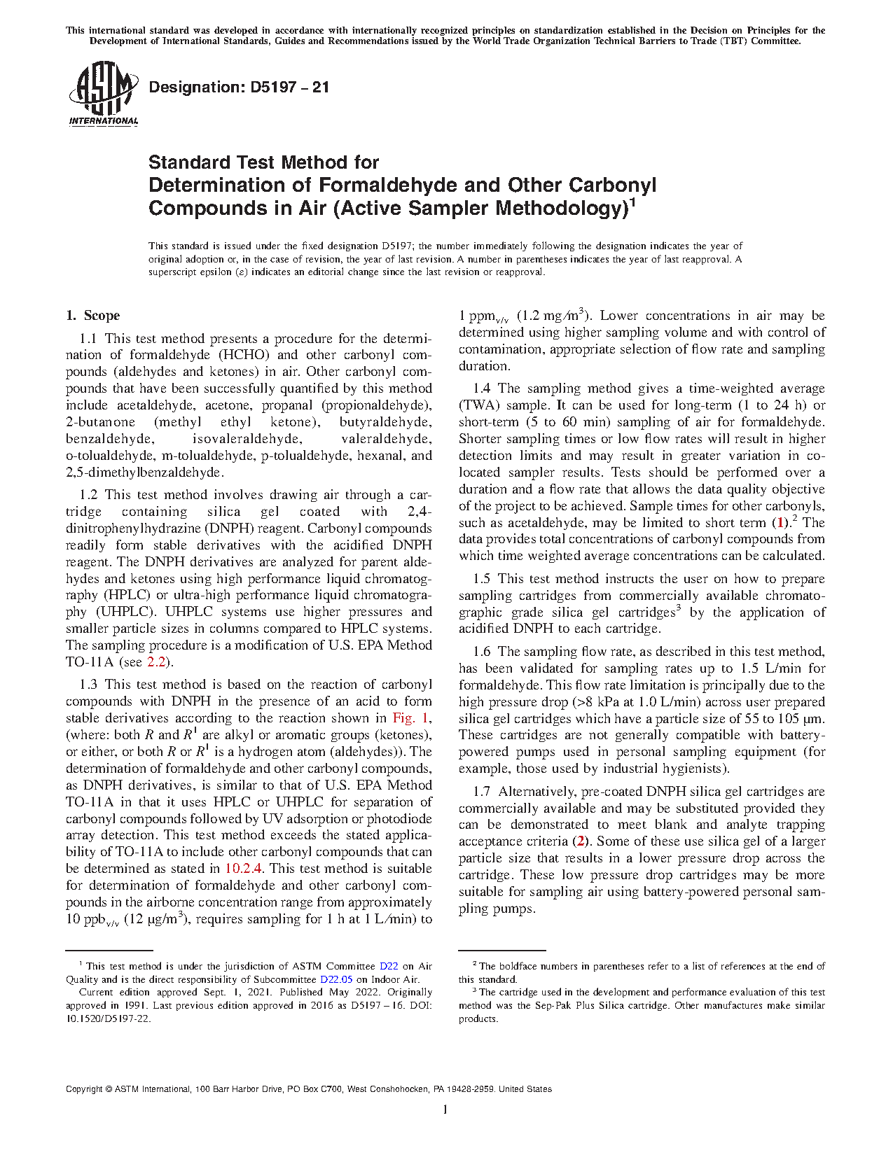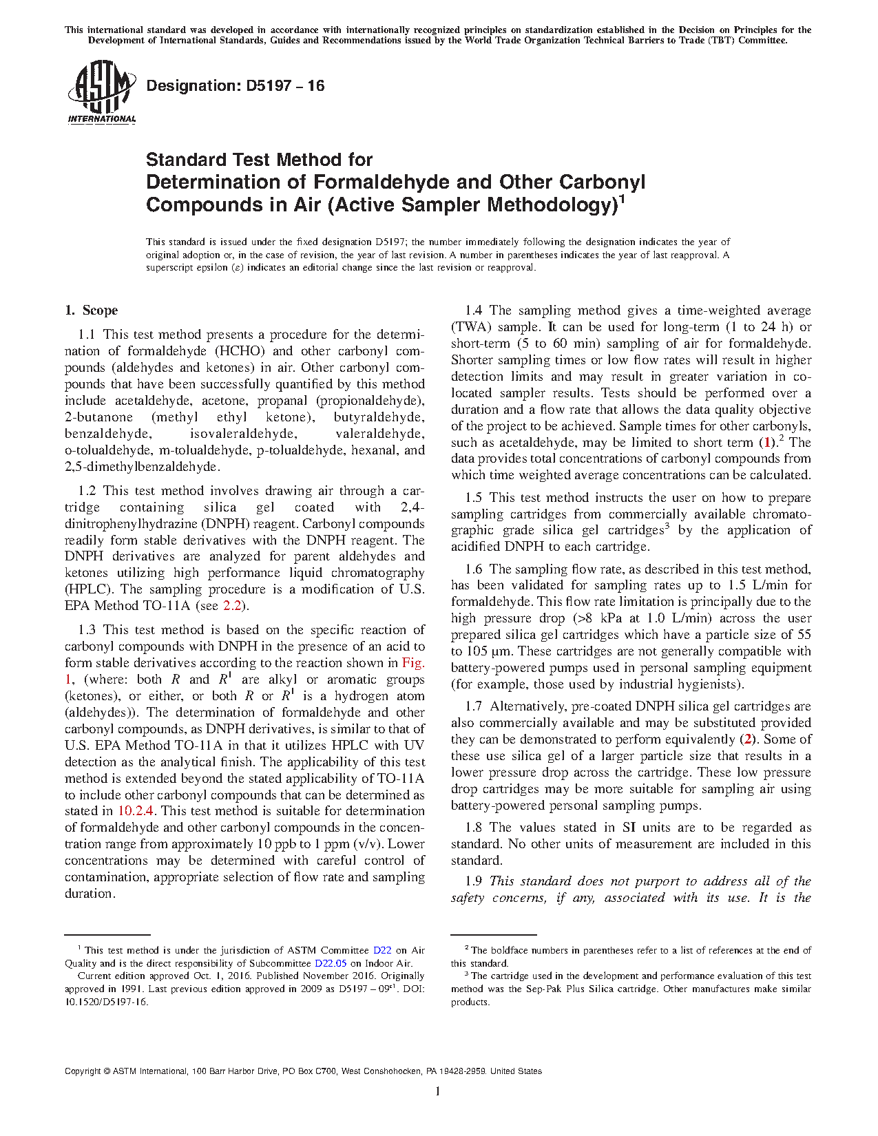 1.3 This test method is based on the reaction of carbonyl compounds with DNPH in the presence of an acid to form stable derivatives according to the reaction shown in Fig. 1, (where: both R and R1 are alkyl or aromatic groups (ketones), or either, or both R or R1 is a hydrogen atom (aldehydes)). The determination of formaldehyde and other carbonyl compounds, as DNPH derivatives, is similar to that of U.S. EPA Method TO-11A in that it uses HPLC or UHPLC for separation of carbonyl compounds followed by UV adsorption or photodiode array detection. This test method exceeds the stated applicability of TO-11A to include other carbonyl compounds that can be determined as stated in 10.2.4. This test method is suitable for determination of formaldehyde and other carbonyl compounds in the airborne concentration range from approximately 10 ppbv/v (12 µg/m3), requires sampling for 1 h at 1 L/min) to 1 ppmv/v (1.2 mg/m3). Lower concentrations in air may be determined using higher sampling volume and with control of contamination, appropriate selection of flow rate and sampling duration.