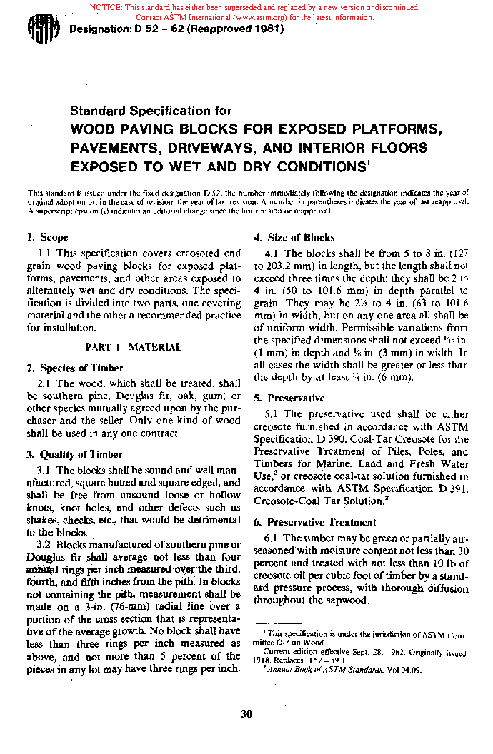 Specification for Wood Paving Blocks for Exposed Platforms, Pavements, Driveways, and Interior Floors Exposed to Wet and Dry Conditions