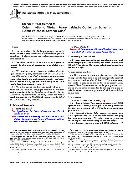 1.1 This test method is for the determination of the weight percent volatile organic compounds of solvent-borne paints in aerosol cans. It offers a unique way to obtain paint specimens from aerosol cans.