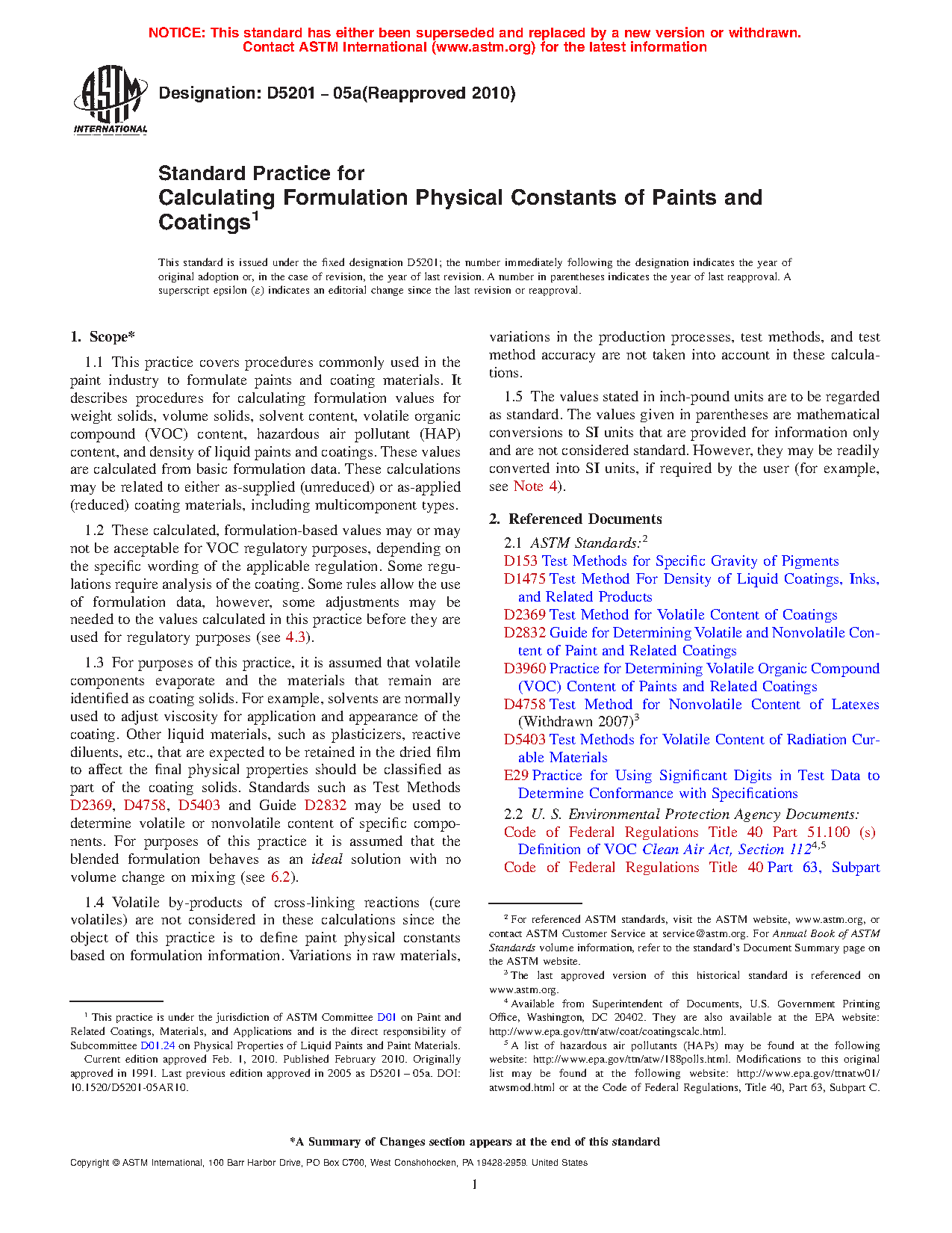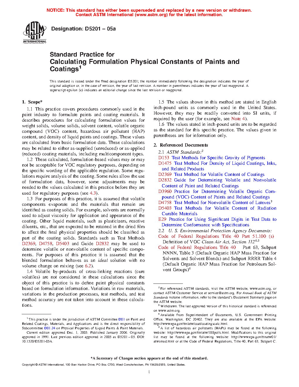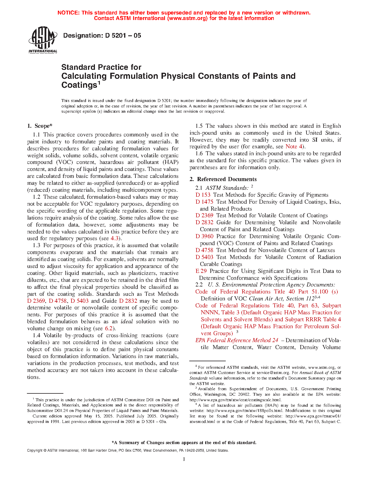 1.1 This practice covers procedures commonly used in the paint industry to formulate paints and coating materials. It describes procedures for calculating formulation values for weight solids, volume solids, solvent content, volatile organic compound (VOC) content, hazardous air pollutant (HAP) content, and density of liquid paints and coatings. These values are calculated from basic formulation data. These calculations may be related to either as-supplied (unreduced) or as-applied (reduced) coating materials, including multicomponent types.