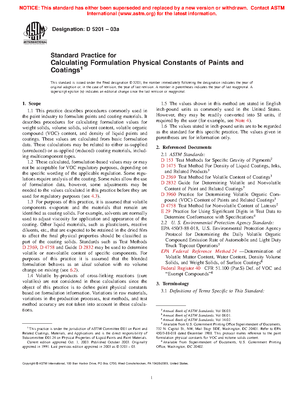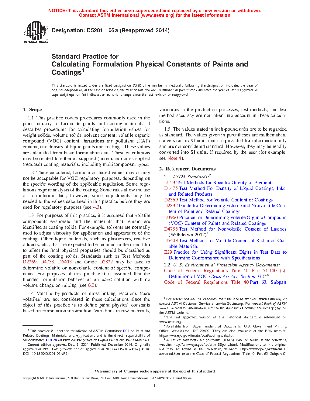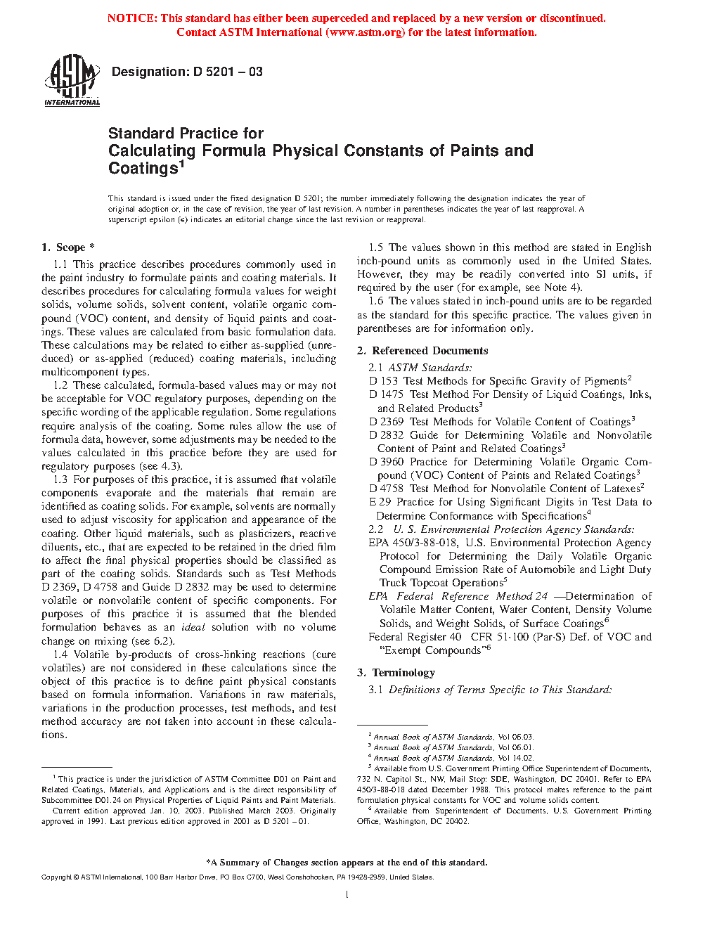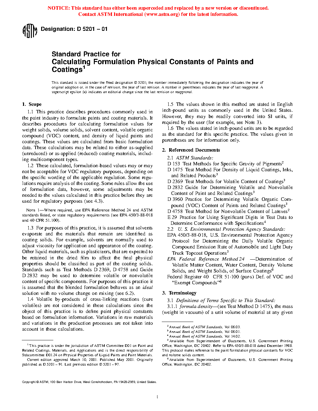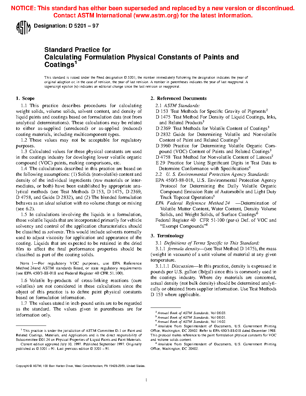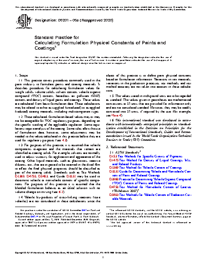 4.1 Physical constants of paints and coatings are required in all aspects of their formulation, manufacture and use. This practice demonstrates standard methods agreed upon for calculating formulation values for some of these physical constants. The calculations are the same for either metric or inch/pound units.