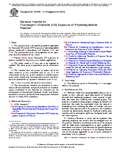 1.1 This practice covers the specific procedures applicable for fluorescent Ultraviolet (UV) exposure of photodegradable plastics conducted in accordance with Practices G151 and G154. This practice also covers the preparation of test specimens and the evaluation of test results.