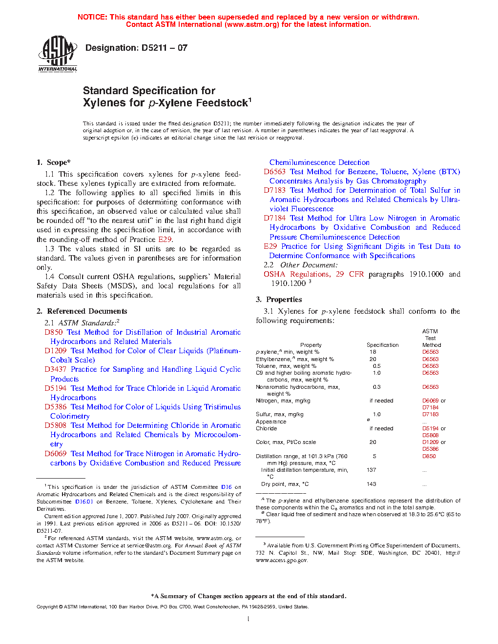 This specification covers xylenes for p-xylene feedstock. Xylenes for p-xylene feedstock shall conform to the following requirements: p-xylene minimum weight percent, ethylbenzene maximum weight percent, toluene maximum weight percent, C9 and higher boiling aromatic hydrocarbons maximum weight percent, nonaromatic hydrocarbons maximum weight percent, nitrogen maximum weight percent if needed, sulfur maximum content, appearance, chloride if needed, color, and distillation range.