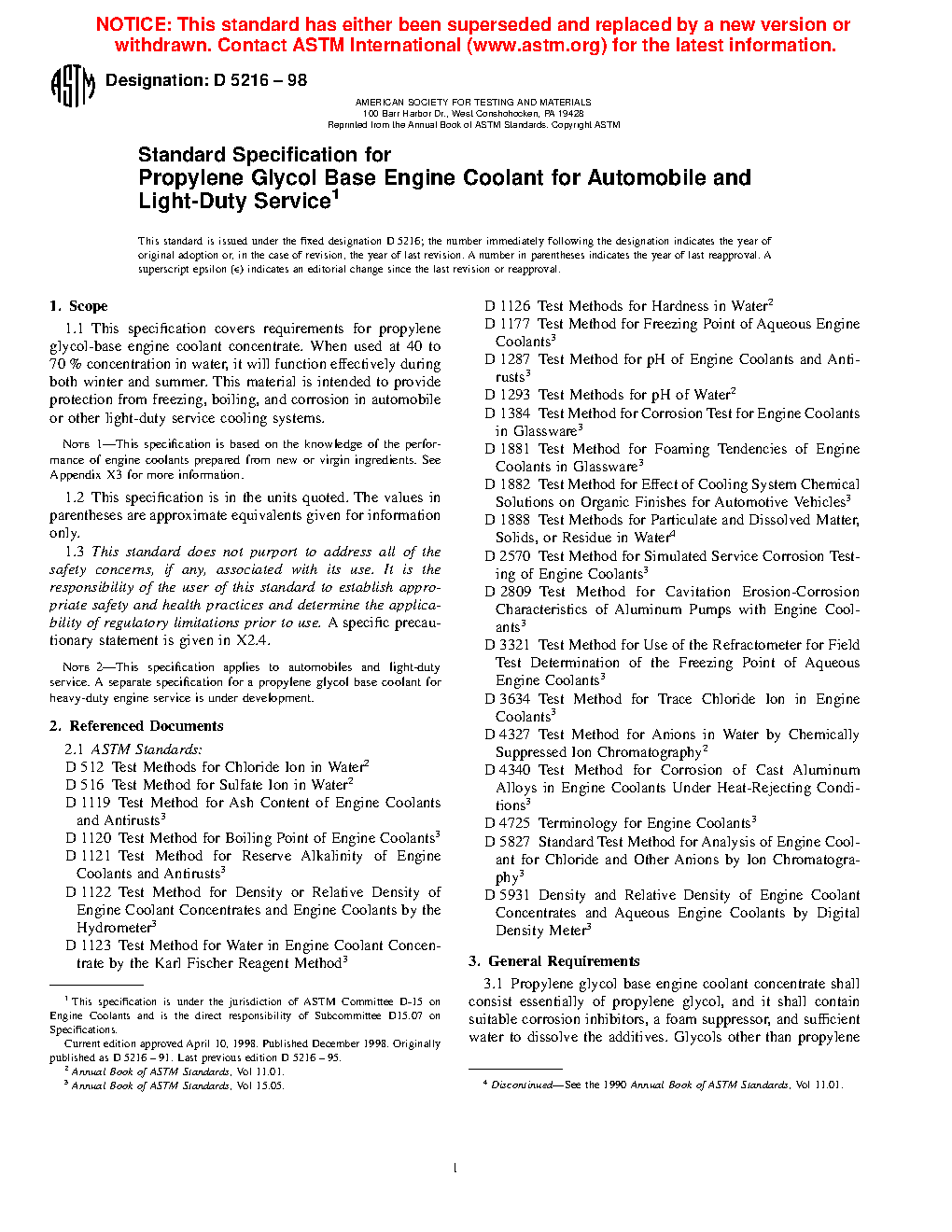 Note 2-This specification applies to automobiles and light-duty service. A separate specification for a propylene glycol base coolant for heavy-duty engine service is under development.Technical characteristics