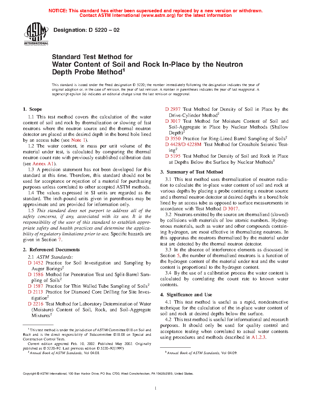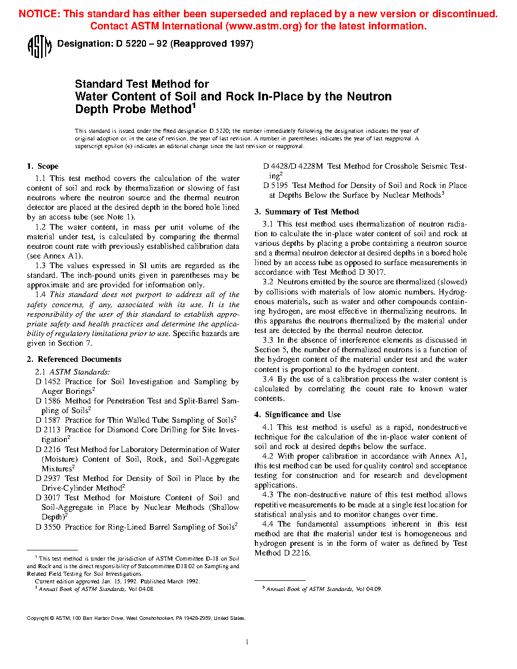 5.1 This test method is useful as a rapid, nondestructive technique for the calculation of the in-place water mass per unit volume of soil and rock at desired depths below the surface.