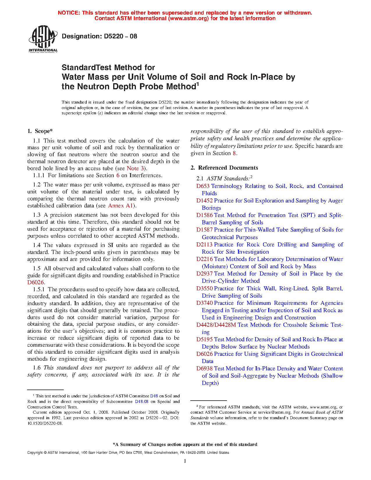 1.1 This test method covers the calculation of the water mass per unit volume of soil and rock by thermalization or slowing of fast neutrons where the neutron source and the thermal neutron detector are placed at the desired depth in the bored hole lined by an access tube.