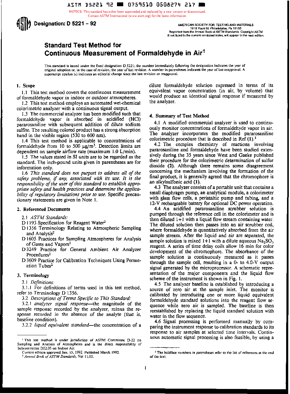 Standard Test Method for Continuous Measurement of Formaldehyde in Air (Withdrawn 1997)