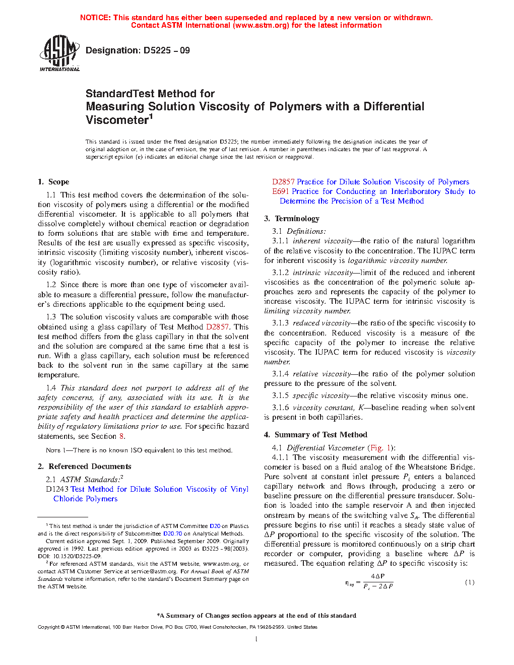 1.1 This test method covers the determination of the solution viscosity of polymers using a differential or the modified differential viscometer. It is applicable to all polymers that dissolve completely without chemical reaction or degradation to form solutions that are stable with time and temperature. Results of the test are usually expressed as specific viscosity, intrinsic viscosity (limiting viscosity number), inherent viscosity (logarithmic viscosity number), or relative viscosity (viscosity ratio).