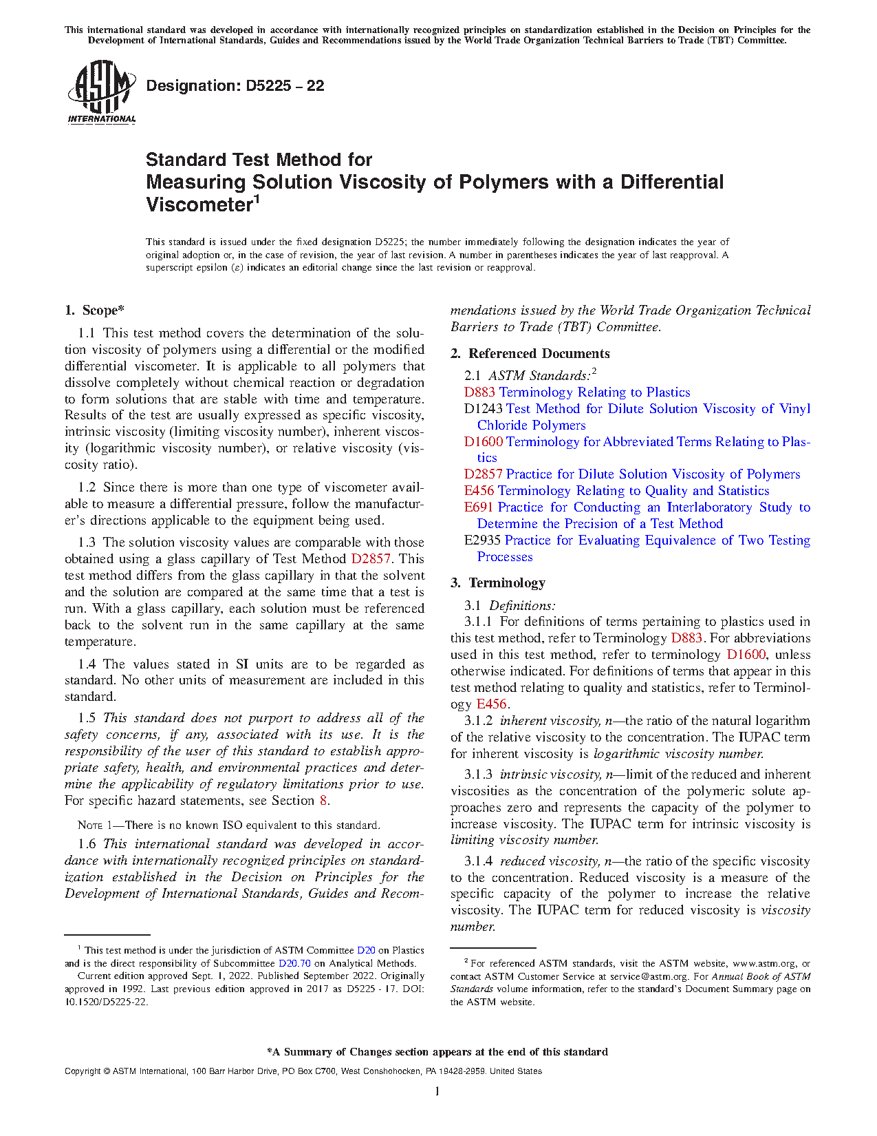 1.1 This test method covers the determination of the solution viscosity of polymers using a differential or the modified differential viscometer. It is applicable to all polymers that dissolve completely without chemical reaction or degradation to form solutions that are stable with time and temperature. Results of the test are usually expressed as specific viscosity, intrinsic viscosity (limiting viscosity number), inherent viscosity (logarithmic viscosity number), or relative viscosity (viscosity ratio).
