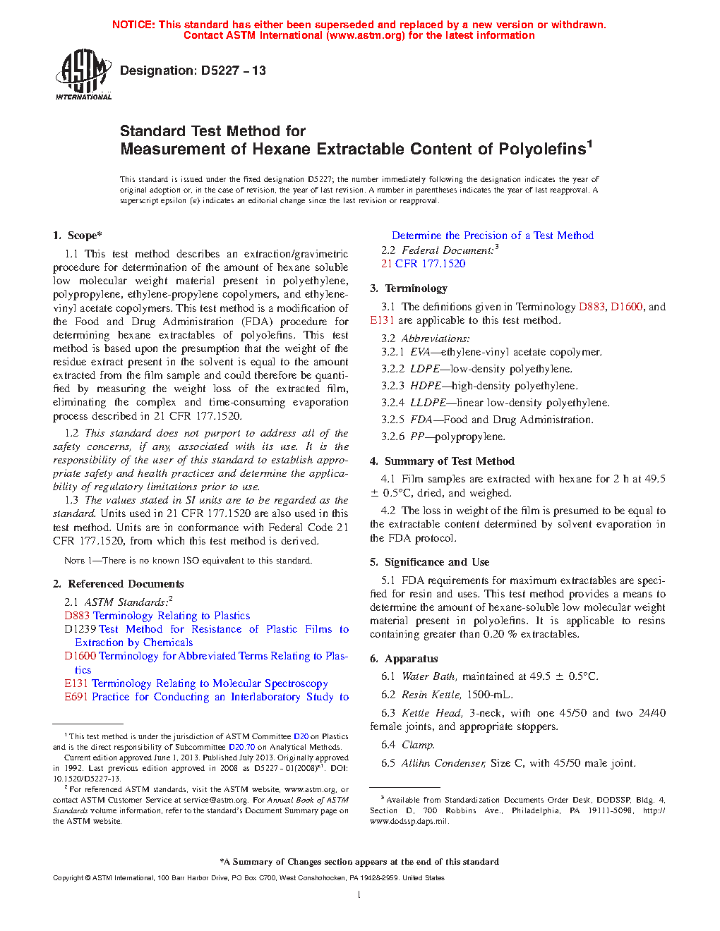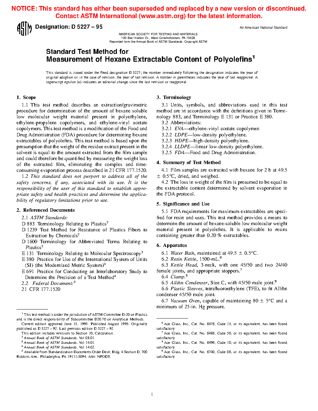 FDA requirements for maximum extractables are specified for resin and uses. This test method provides a means to determine the amount of hexane-soluble low molecular weight material present in polyolefins. It is applicable to resins containing greater than 0.20 % extractables.
