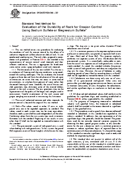 1.1 This test method covers test procedures for evaluating the soundness of rock for erosion control by the effects of a sodium or magnesium sulfate solution on slabs of rock. It is an accelerated weathering test. The rock slabs, prepared in accordance with procedures in Practice D5121, are intended to be representative of erosion control sized materials and their inherent weaknesses. The test is appropriate for breakwater stone, armor stone, riprap and gabion sized rock materials.