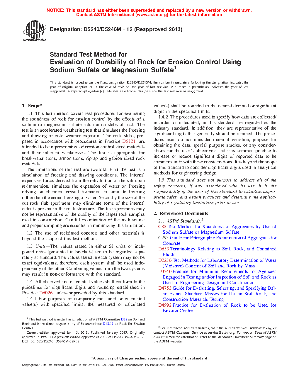 5.2 The sodium sulfate or magnesium sulfate soundness test is one method by which to estimate qualitatively the durability of rock under weathering conditions. This test method was developed to be used in conjunction with additional test methods listed in Practice D4992. This test method does not provide an absolute value, but rather an indication of the resistance to freezing and thawing; therefore, the results of this test method are not to be used as the sole basis for the determination of rock durability.