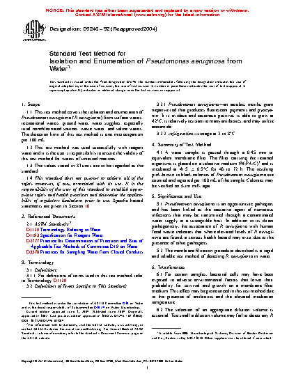 1.1 The test method covers the isolation and enumeration of Pseudomonas aeruginosa. Testing was performed on spiked samples using reagent grade water as the diluent from surface waters; recreational waters; ground water, water supplies; especially rural nonchlorinated sources; waste water; and saline waters. The detection limit of this test method is one microorganism per 100 mL.