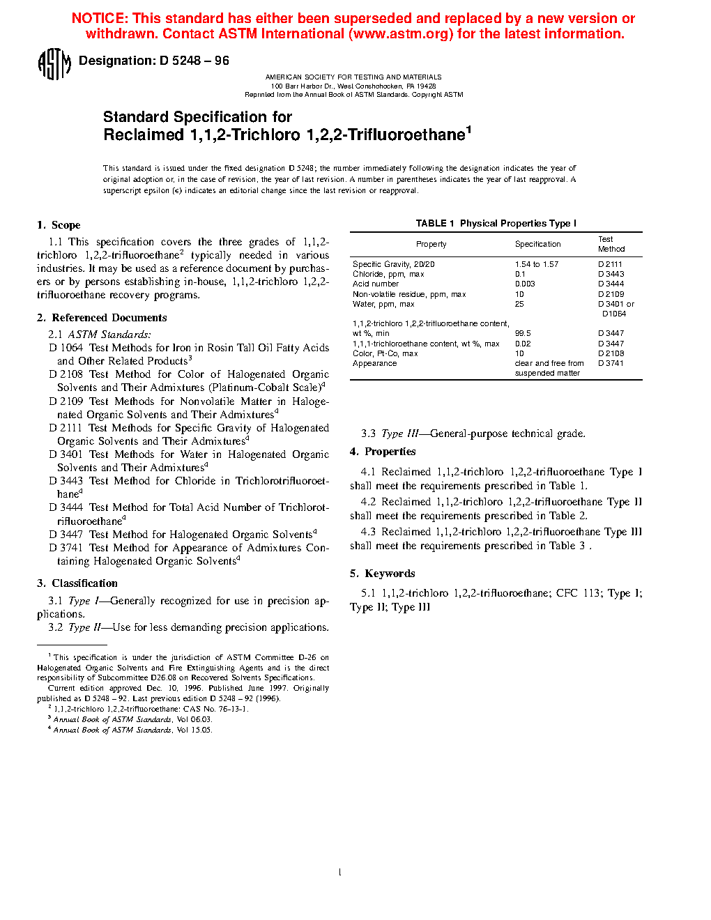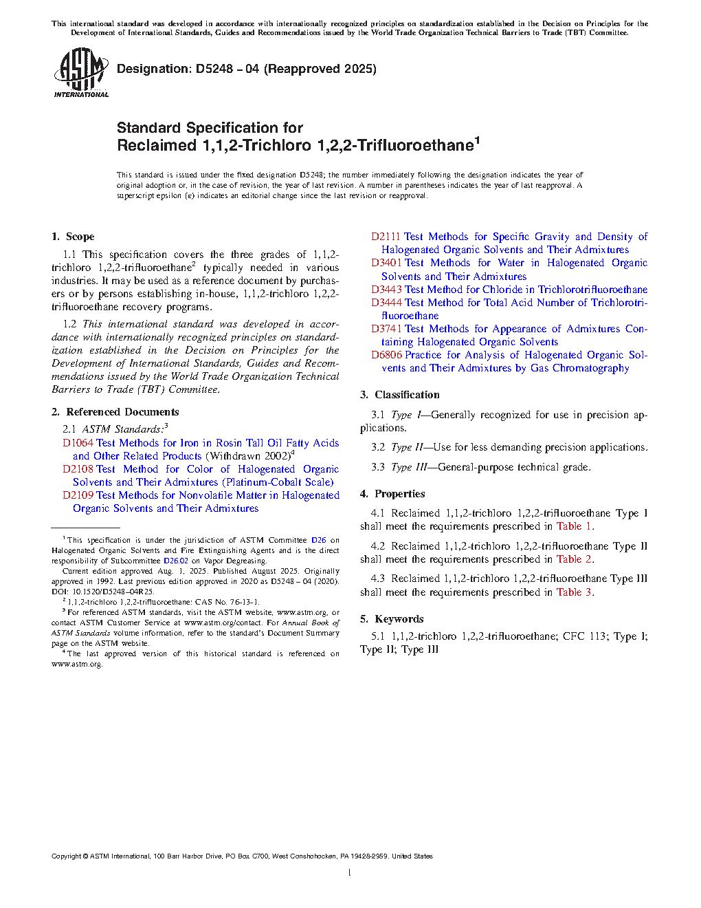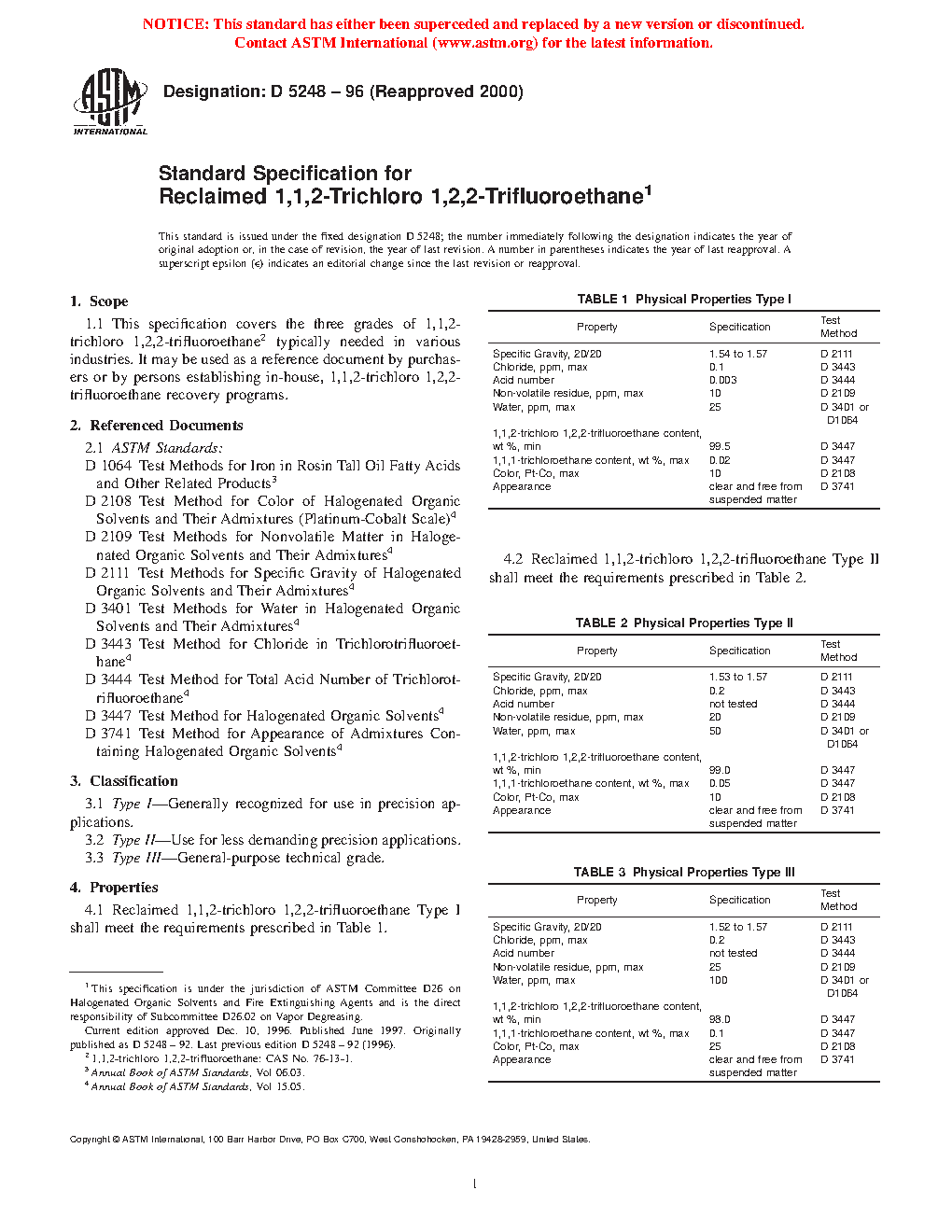 This specification covers the three grades of 1,1,2- trichloro 1,2,2 trifluoroethane typically needed in various industries. This may be a reference for 1,1,2-trichloro 1,2,2- trifluoroethane recovery programs. The three classifications are as follows: Type I - generally recognized for use in precision applications; Type II - used for less demanding precision applications; and Type III - general-purpose technical grade. Materials shall be tested and the individual grades shall conform to specified values of specific gravity, chloride content, acid number, non-volatile residue content, water content, 1,1,2-trichloro 1,2,2- trifluoroethane content, 1,1,1- trichloroethane content, color, and appearance.