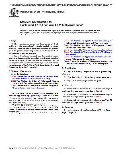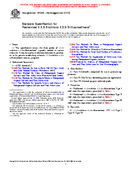 1.1 This specification covers the three grades of 1,1,2-trichloro 1,2,2-trifluoroethane2 typically needed in various industries. It may be used as a reference document by purchasers or by persons establishing in-house, 1,1,2-trichloro 1,2,2-trifluoroethane recovery programs.