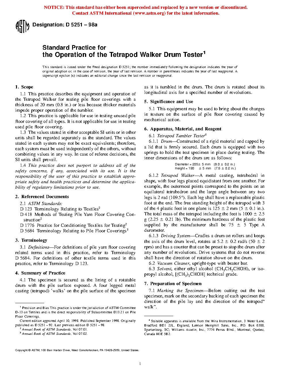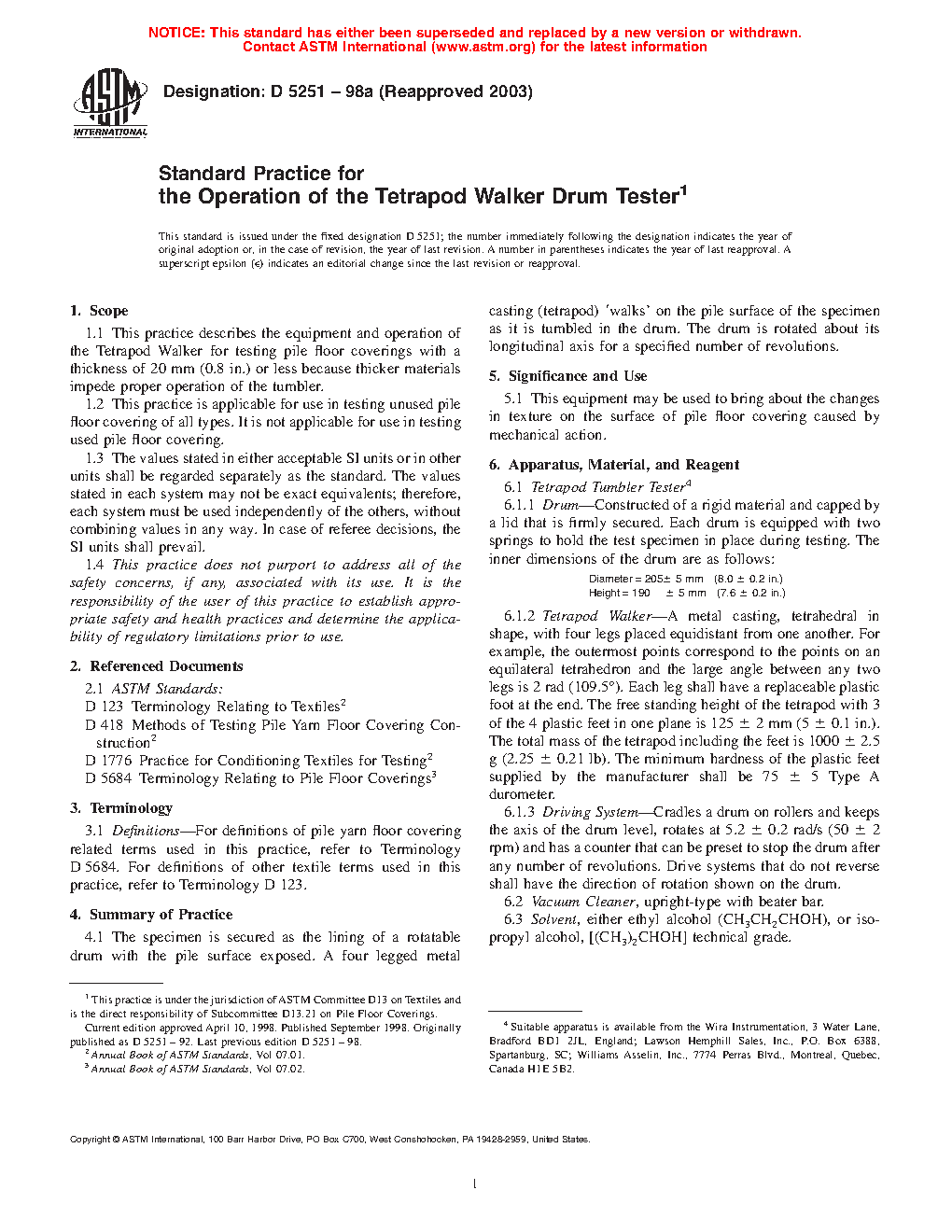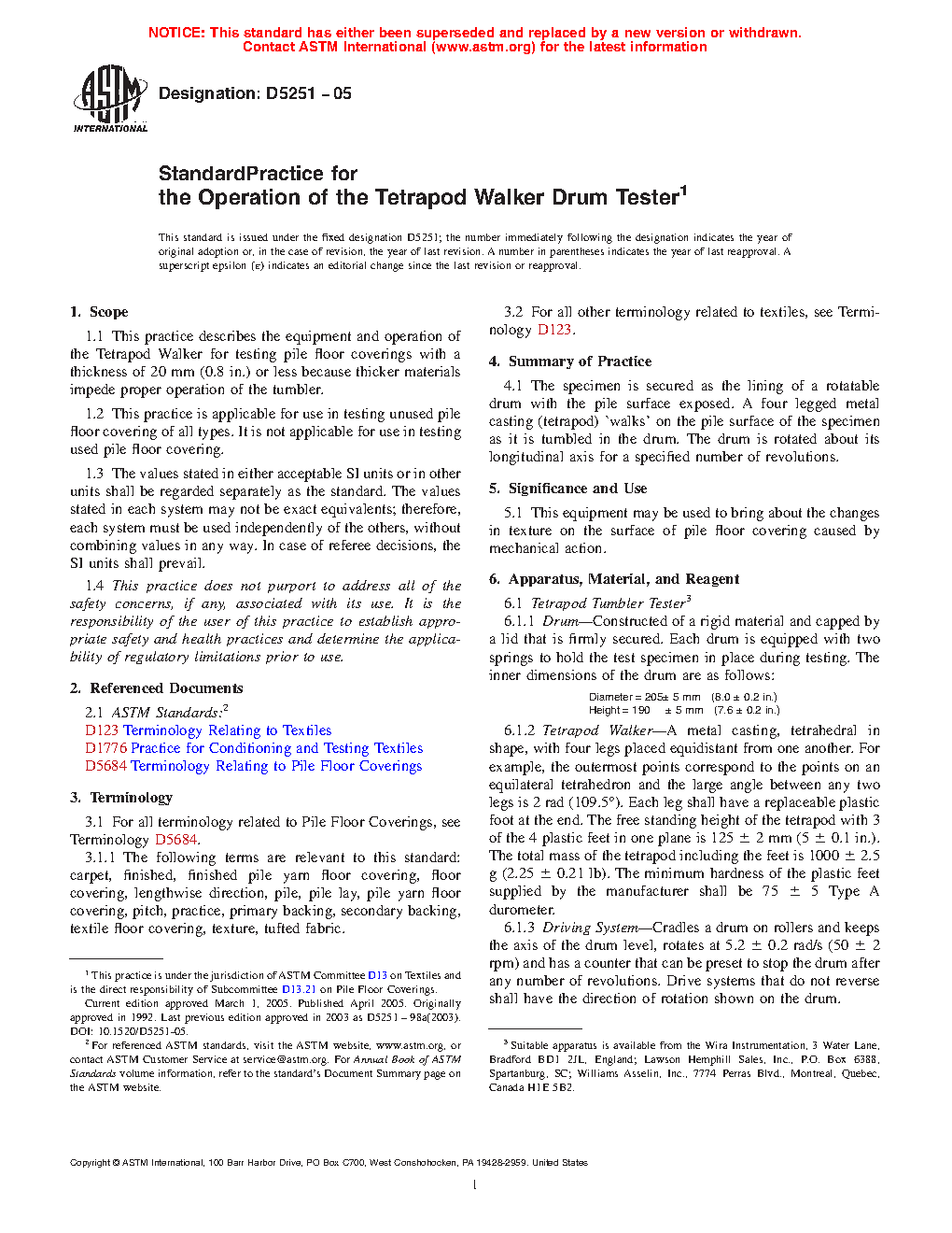 1.1 This practice describes the equipment and operation of the Tetrapod Walker for testing pile floor coverings with a thickness of 20 mm (0.8 in.) or less because thicker materials impede proper operation of the tumbler.